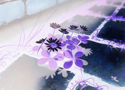 Edytor tapety: Białe kwiatki z listkami i trawa między kamiennymi płytami