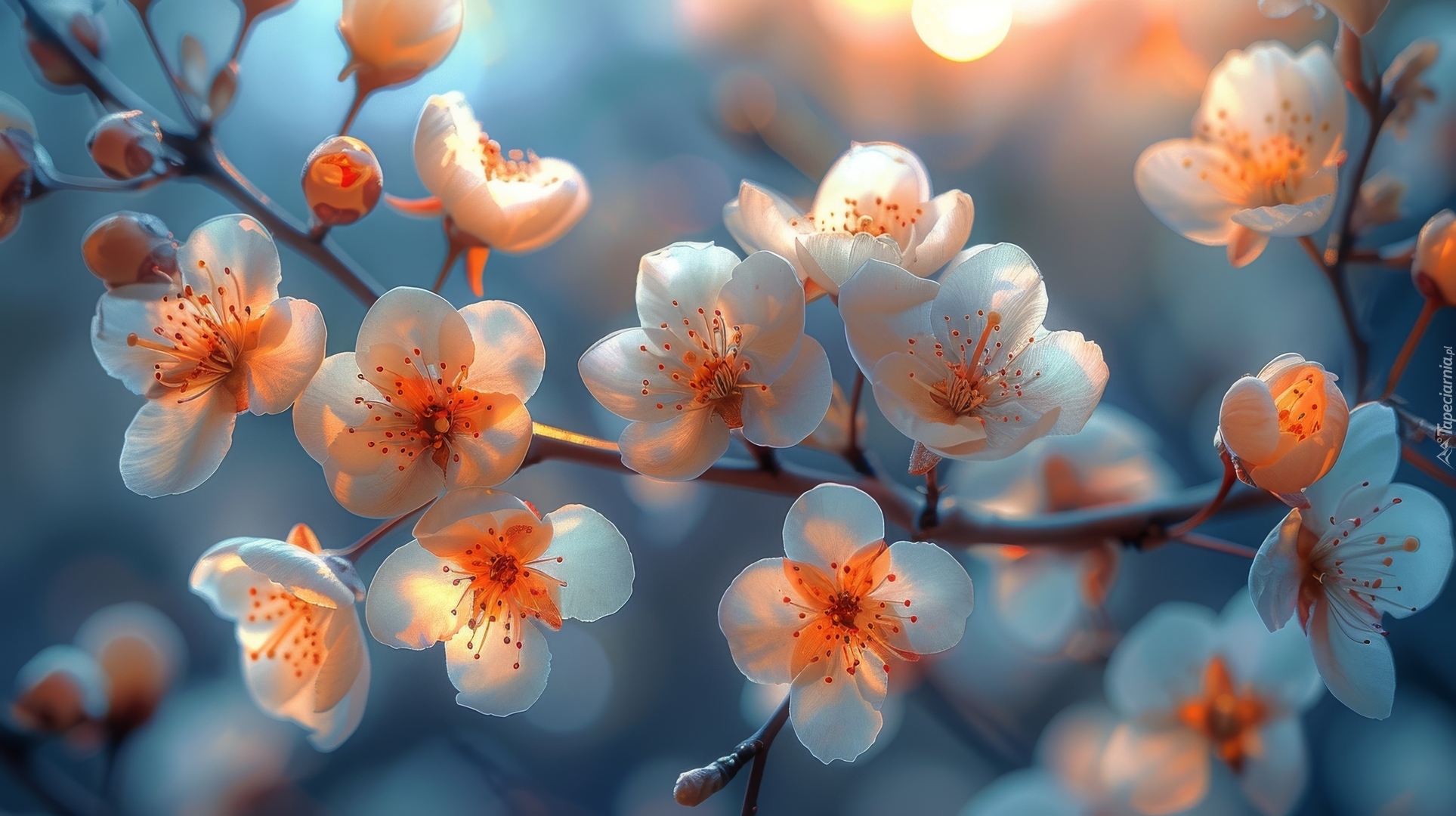 Edytor tapety: Rozświetlone biało-pomarańczowe kwiaty na gałązce
