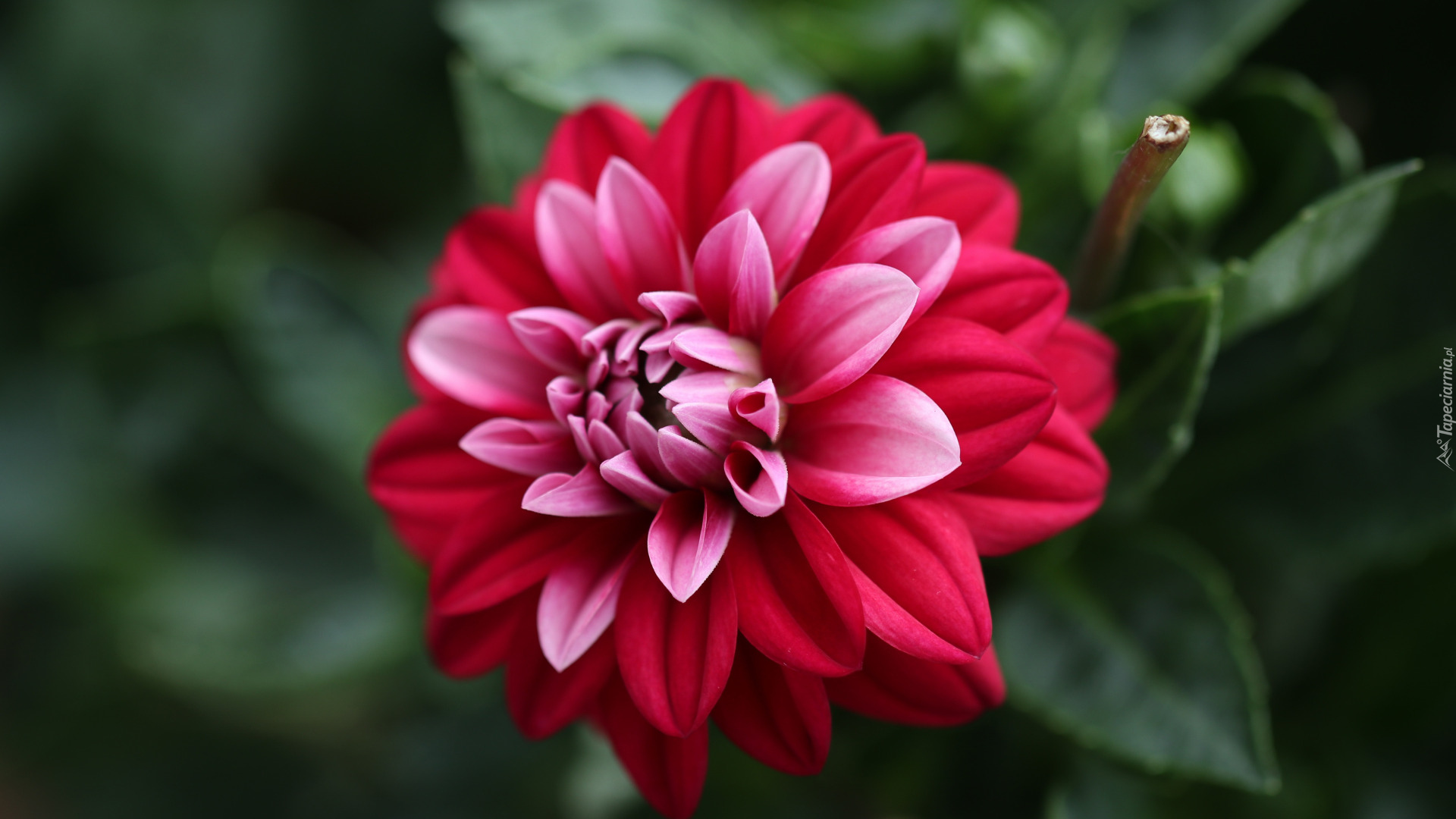 Edytor tapety: Różowo-czerwona dalia w zbliżeniu na rozmytym tle