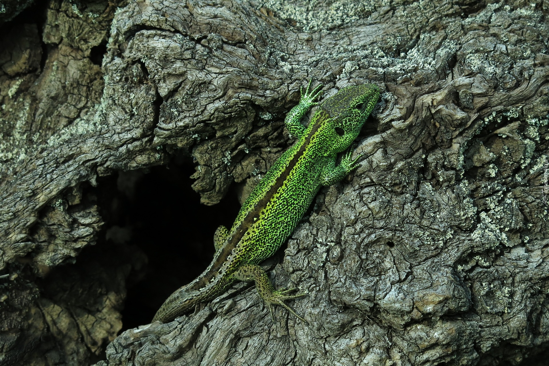 Edytor tapety: Zielona jaszczurka zwinka na drzewie