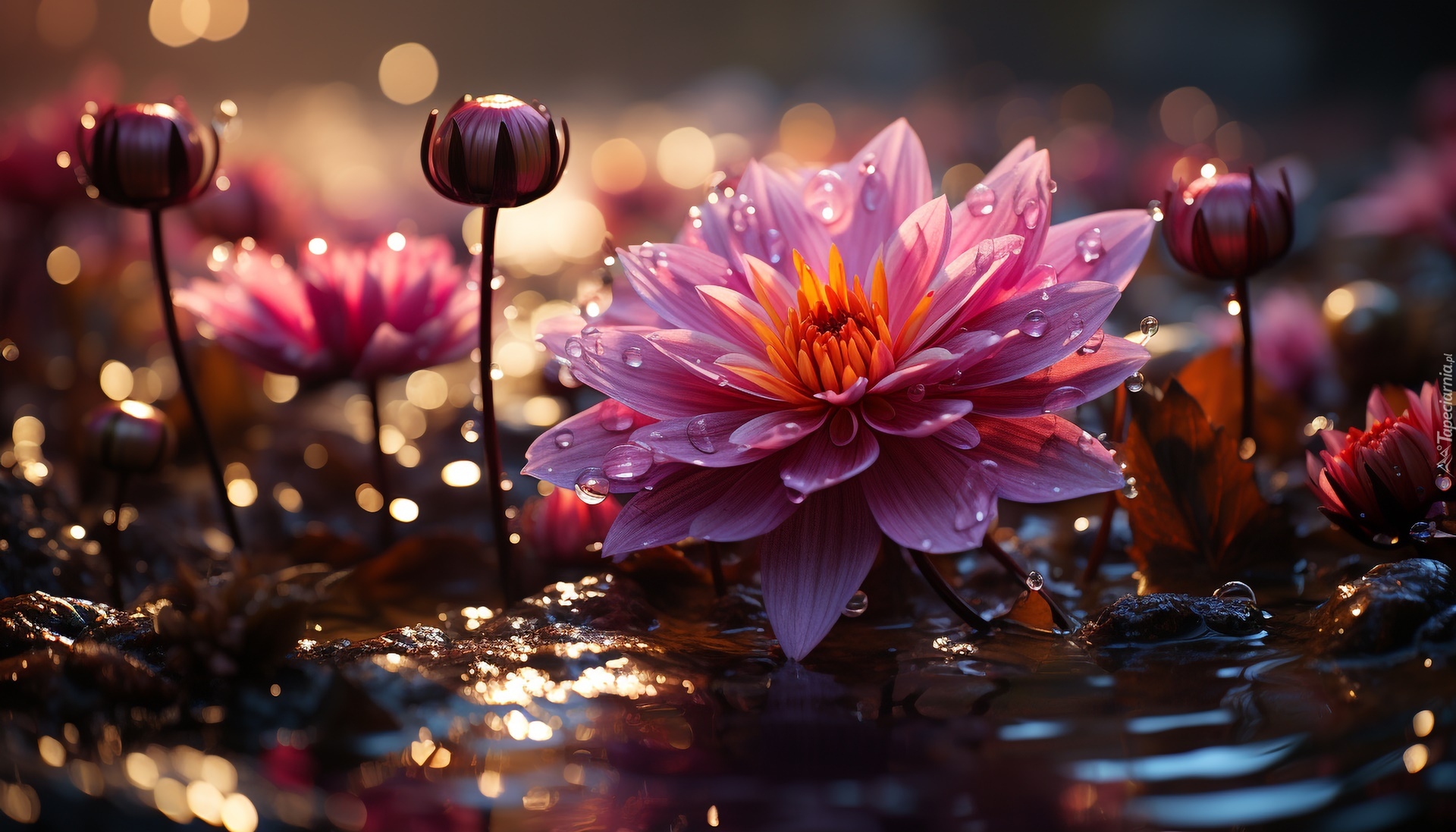 Edytor tapety: Lilia wodna i pąki pokryte kroplami wody