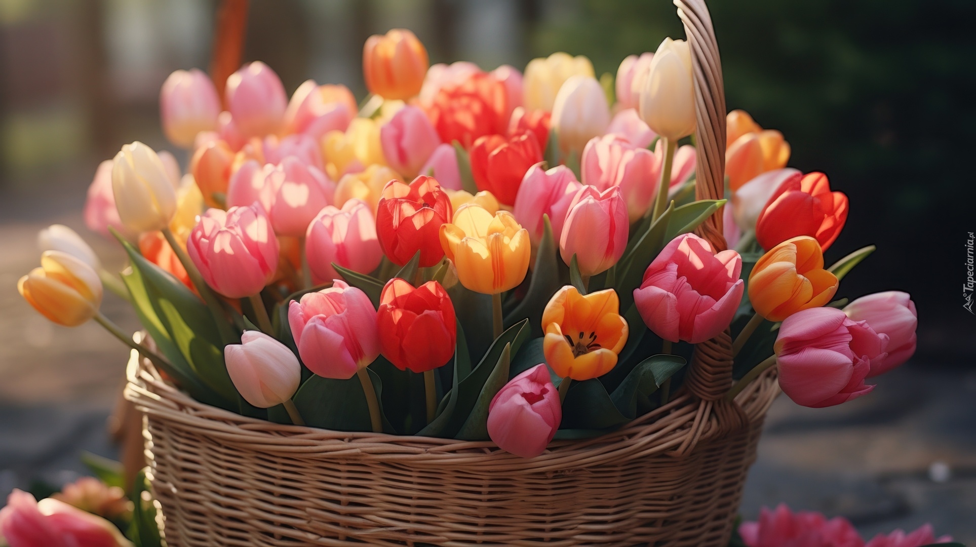 Edytor tapety: Wiklinowy kosz z kolorowymi tulipanami