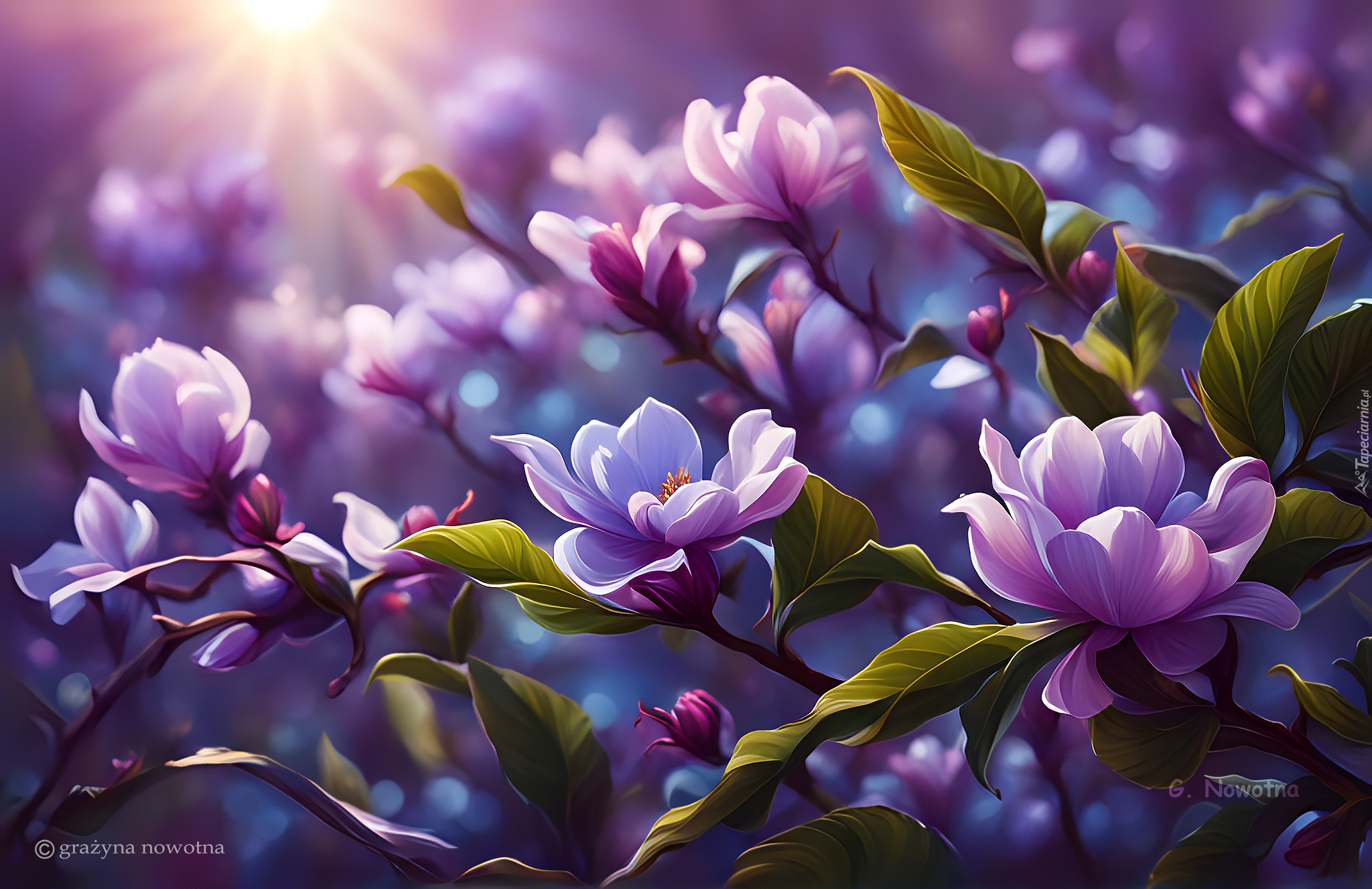 Edytor tapety: Rozświetlone kwiaty magnolii w grafice