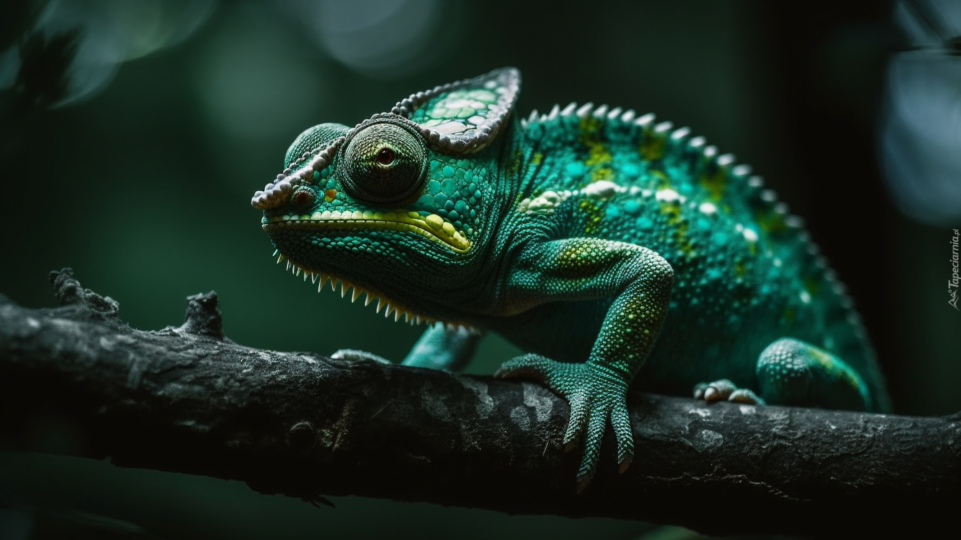Edytor tapety: Zielony kameleon na gałęzi