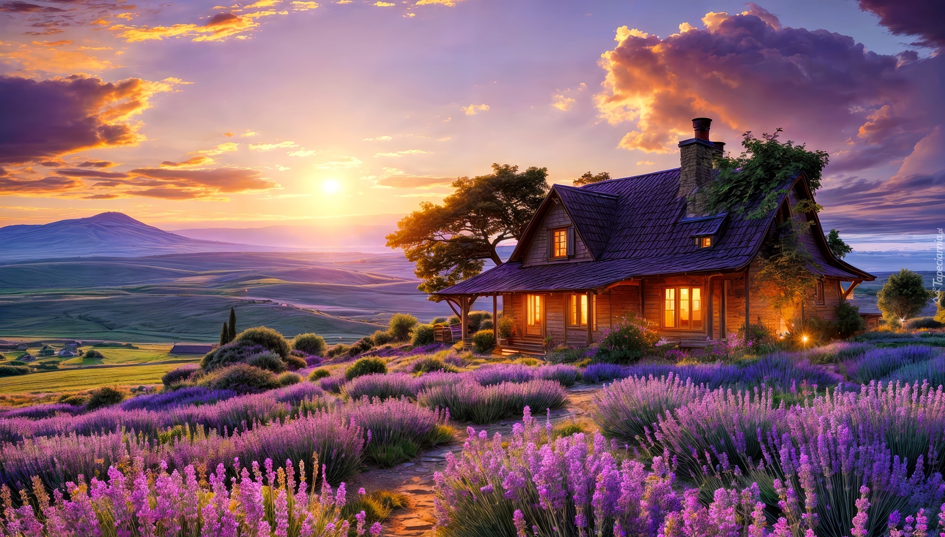 Edytor tapety: Oświetlony dom wśród kwitnącej lawendy o zachodzie słońca