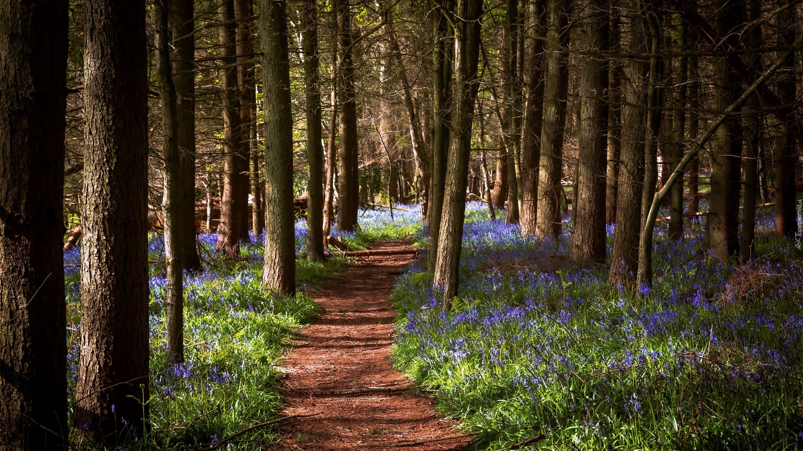 Edytor tapety: Niebieskie kwiaty przy leśnej ścieżce