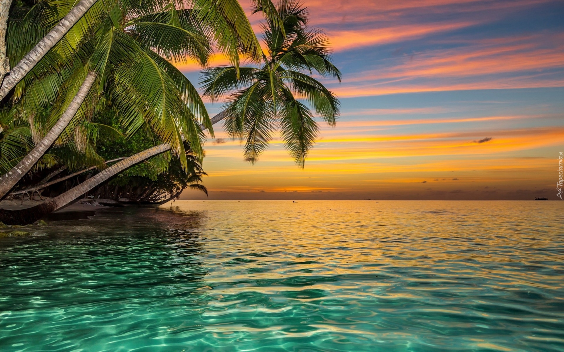 Edytor tapety: Palmy pochylone nad morzem pod kolorowym niebem