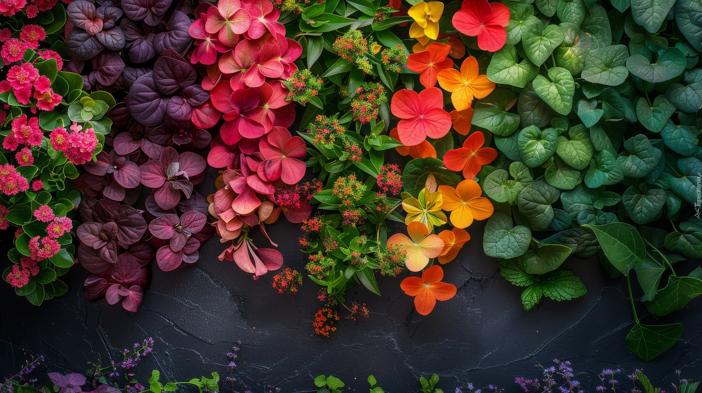Edytor tapety: Kolorowe hortensje i liście na ciemnym tle