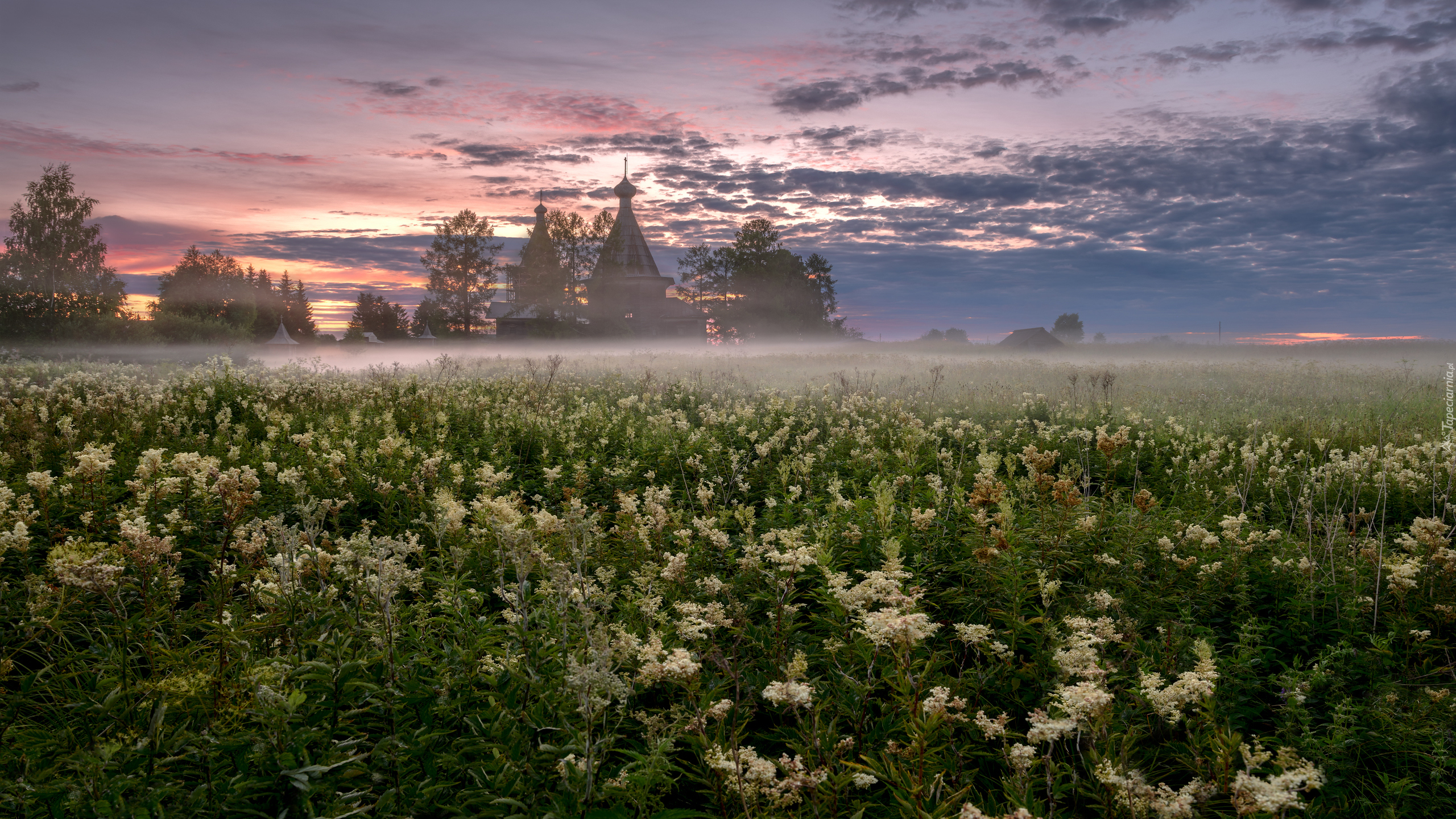 Edytor tapety: Cerkiew i kwiaty na zamglonej o poranku łące