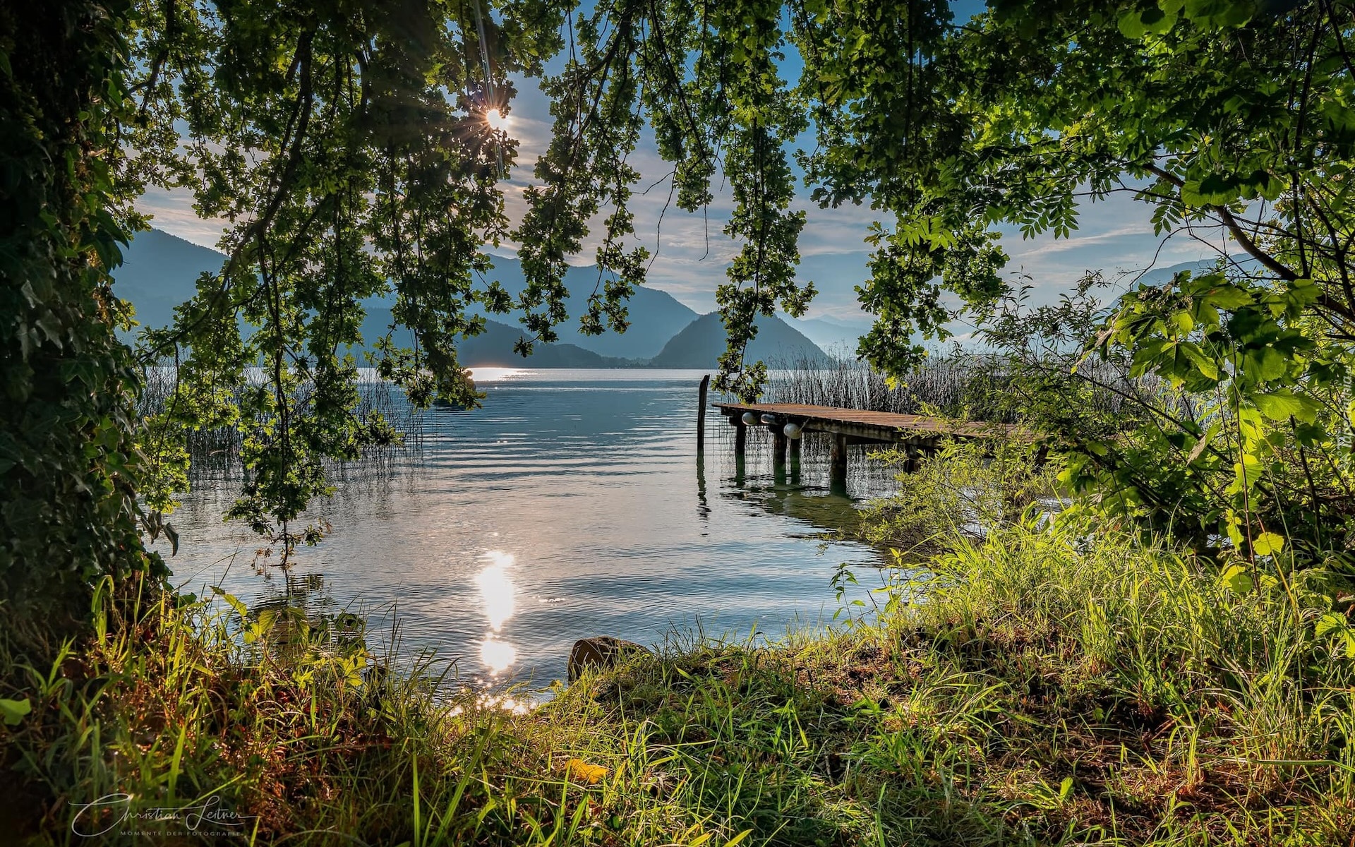 Edytor tapety: Góry i pomost na jeziorze Wolfgangsee w Austrii