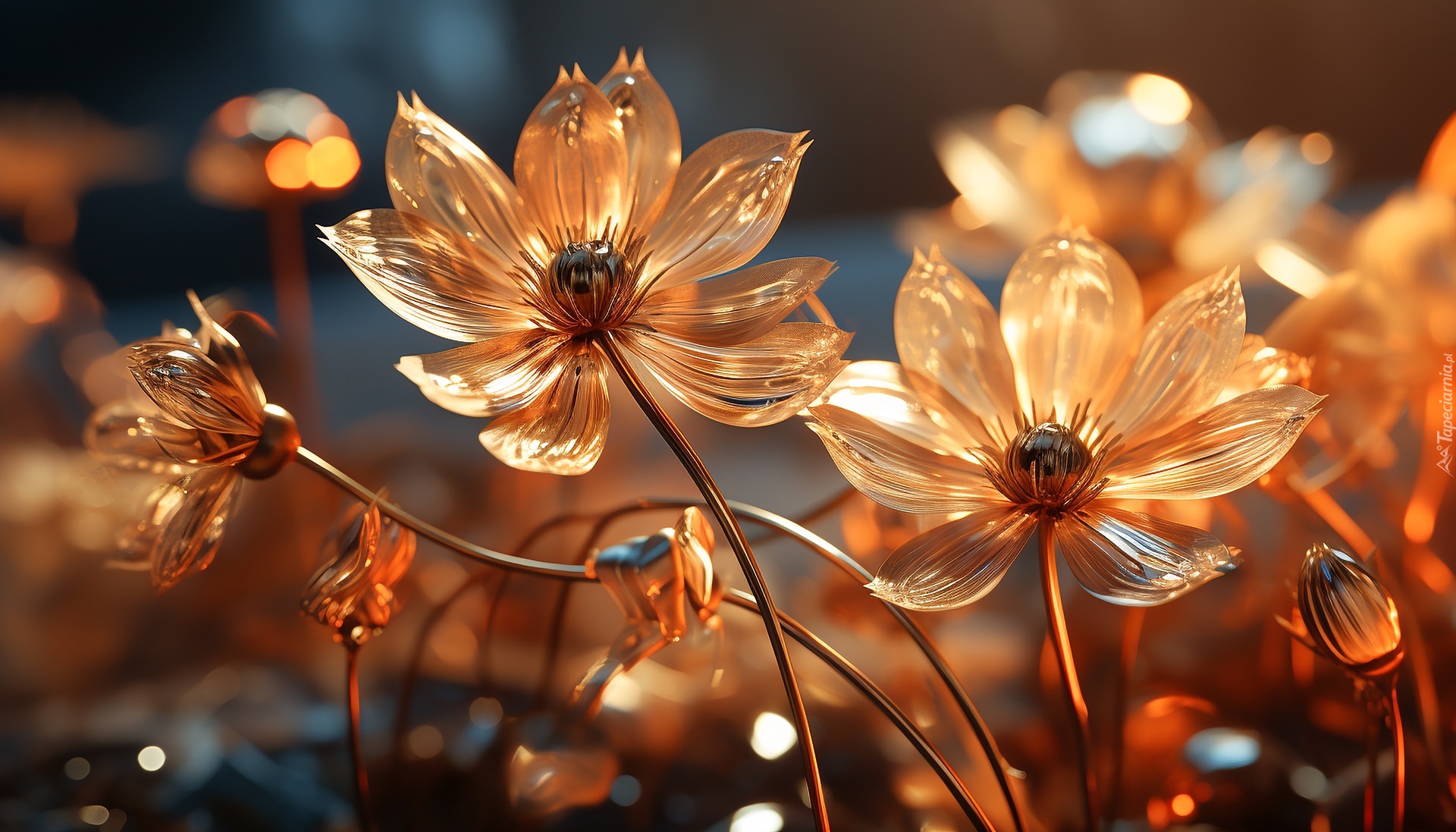 Edytor tapety: Rozświetlone pomarańczowe szklane kwiaty w grafice