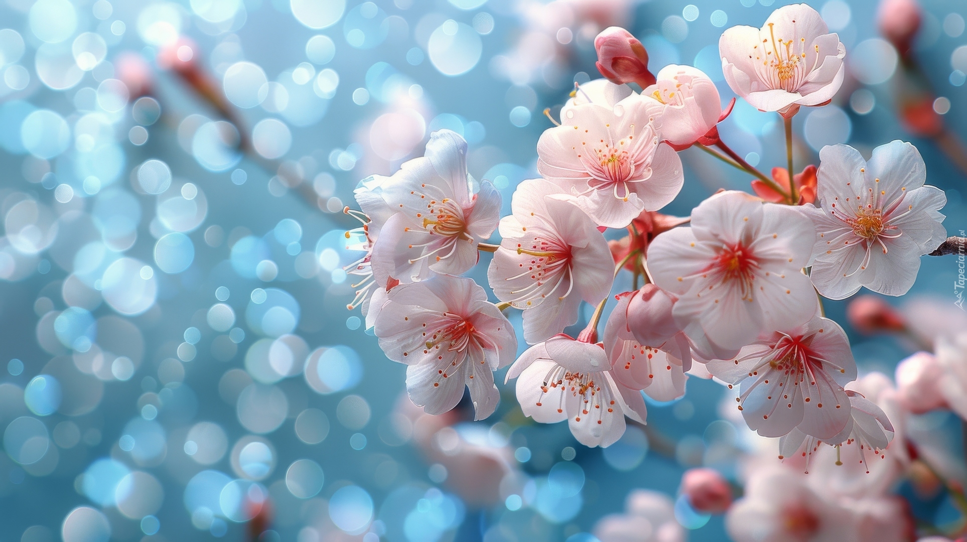 Edytor tapety: Rozświetlone i rozkwitnięte jasnoróżowe kwiaty na gałązce