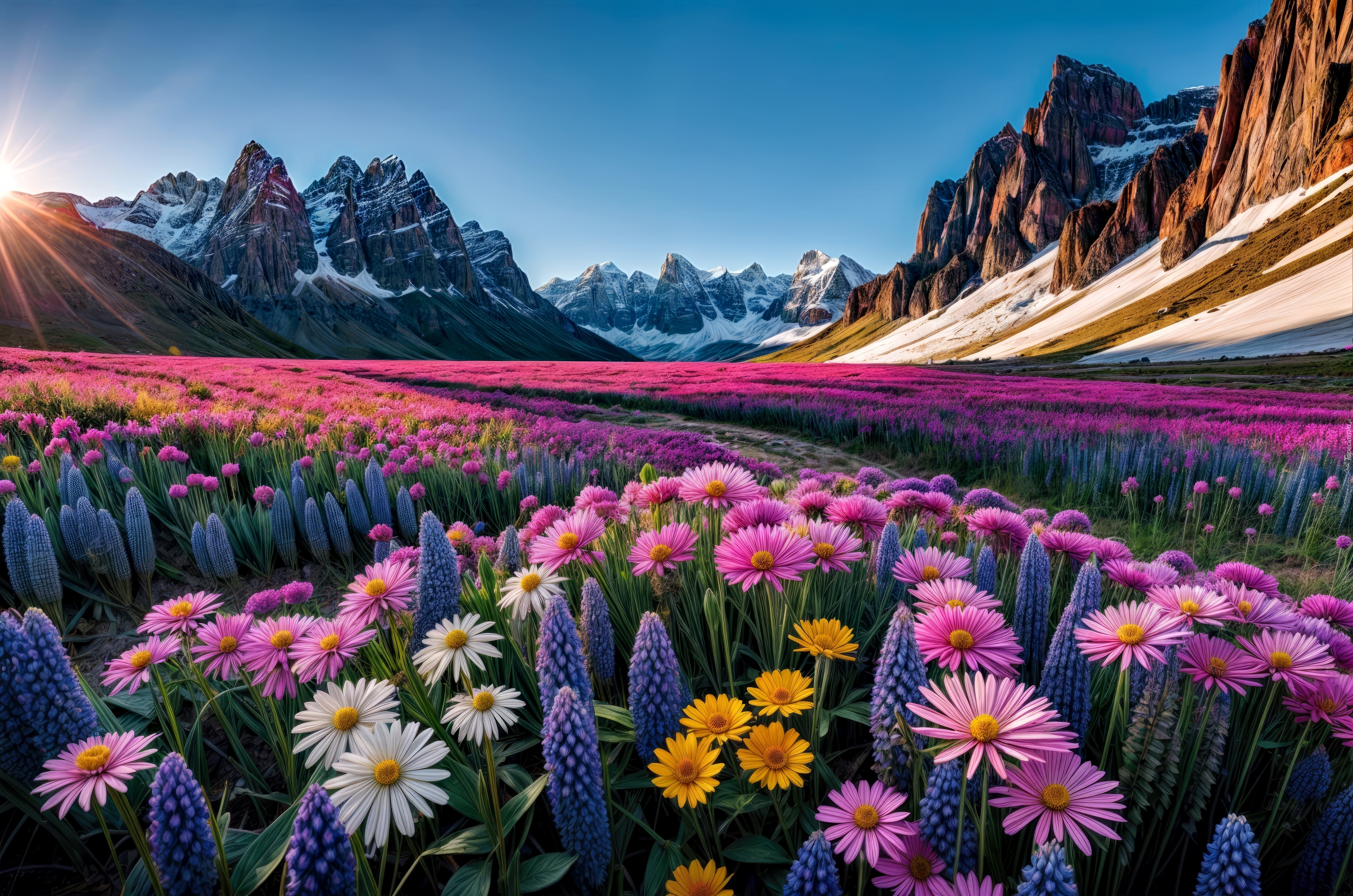 Edytor tapety: Ukwiecona polana i lekko ośnieżone góry