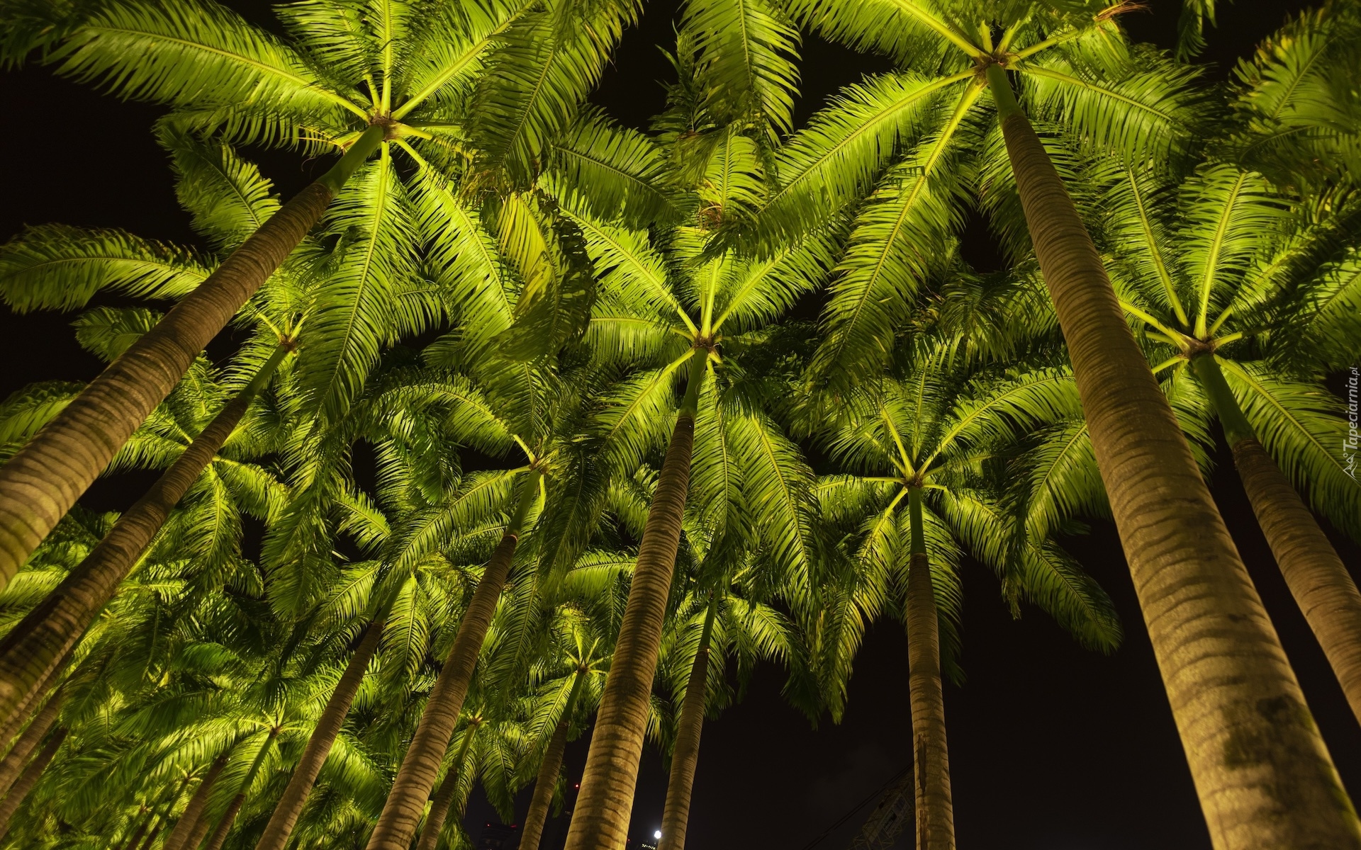 Edytor tapety: Rozświetlone wierzchołki palm na tle nocnego nieba