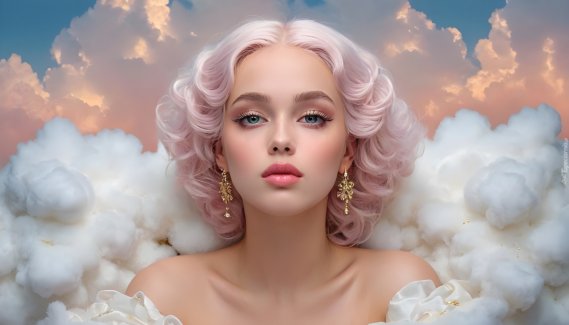 Edytor tapety: Blondynka z kolczykami na tle chmur