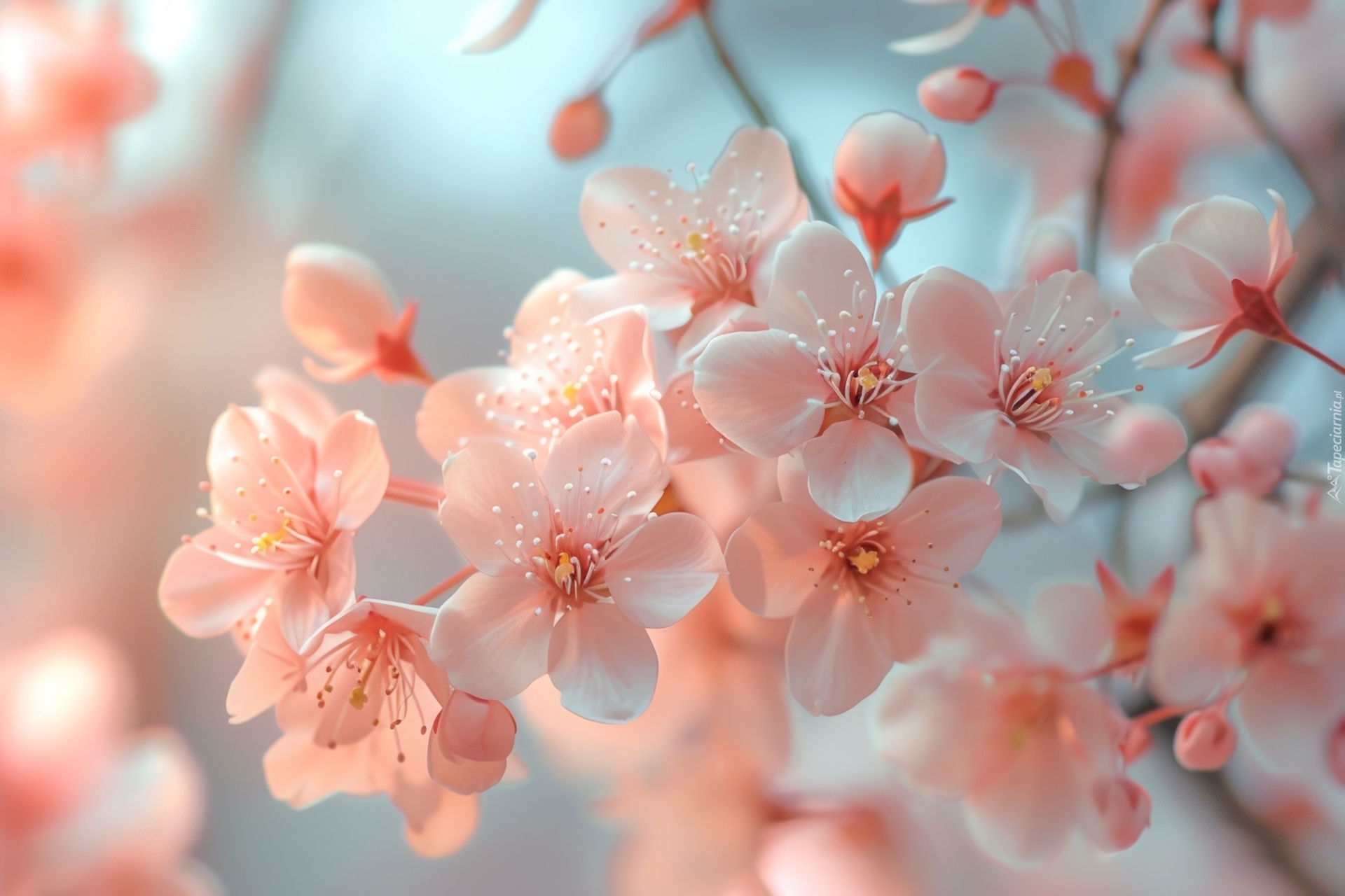 Edytor tapety: Rozświetlone światłem kwiaty na gałązkach drzewa owocowego