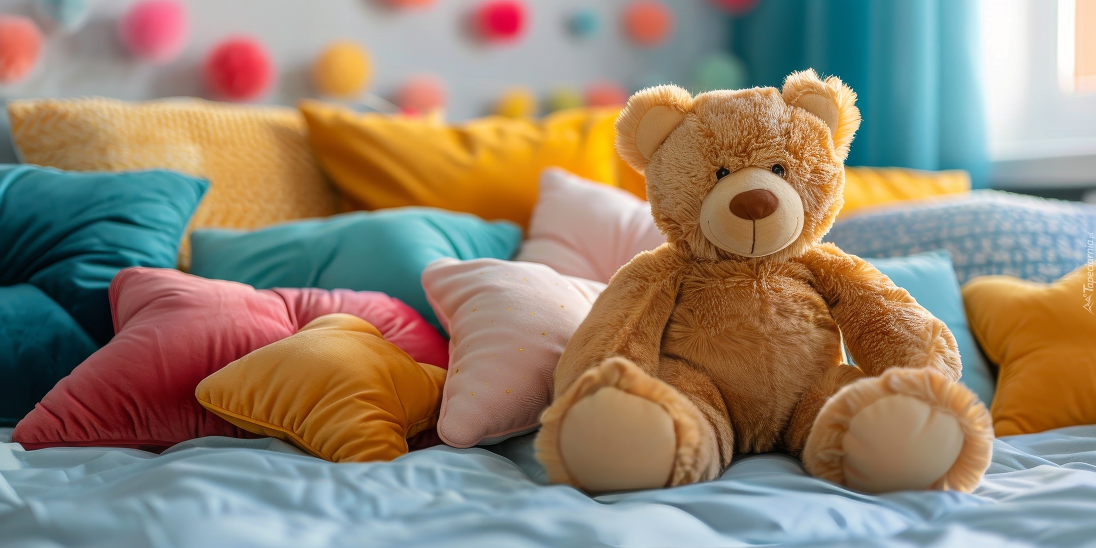 Edytor tapety: Miś na łóżku i kolorowe poduszki