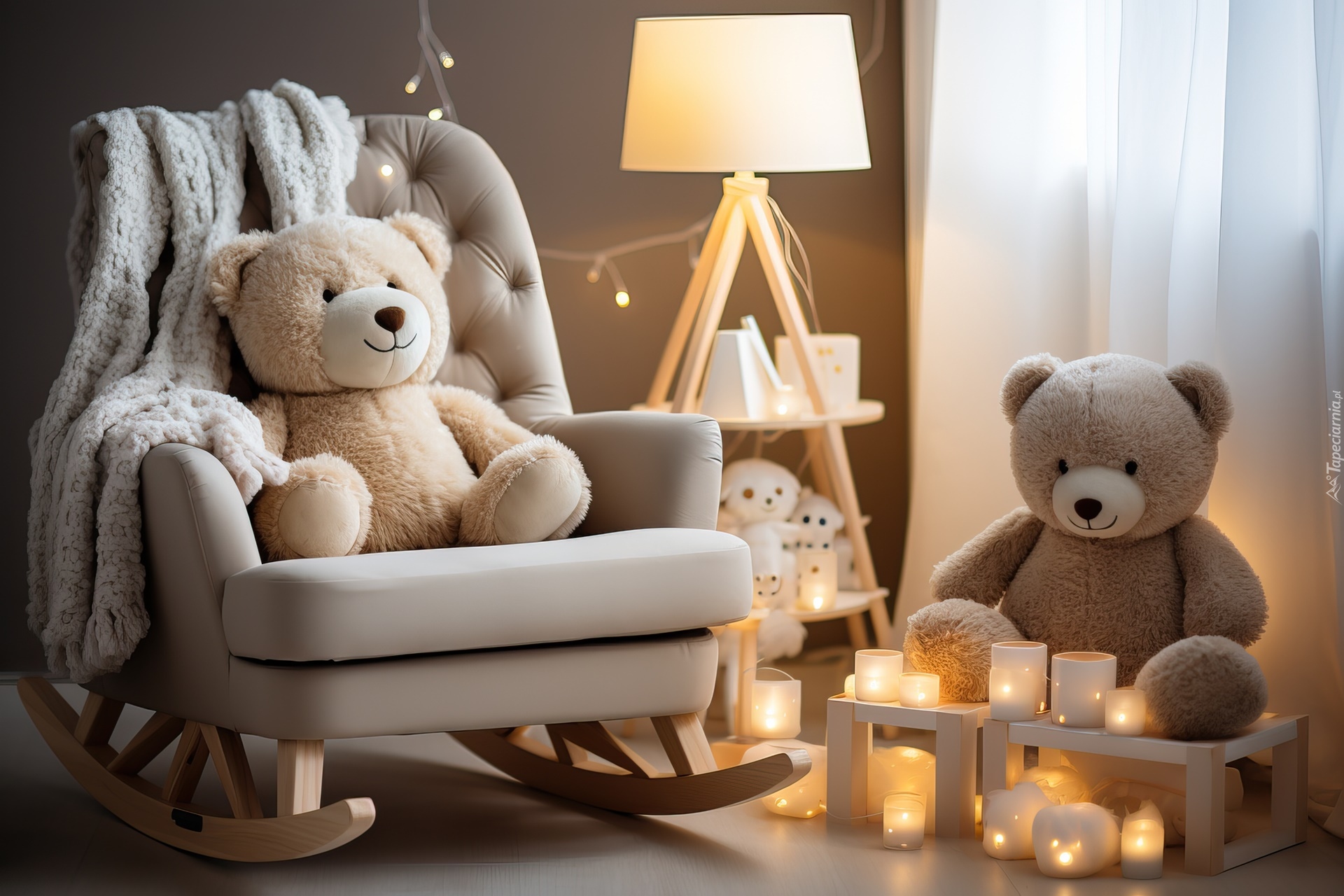 Edytor tapety: Dwa pluszowe misie obok lampy przy świecach