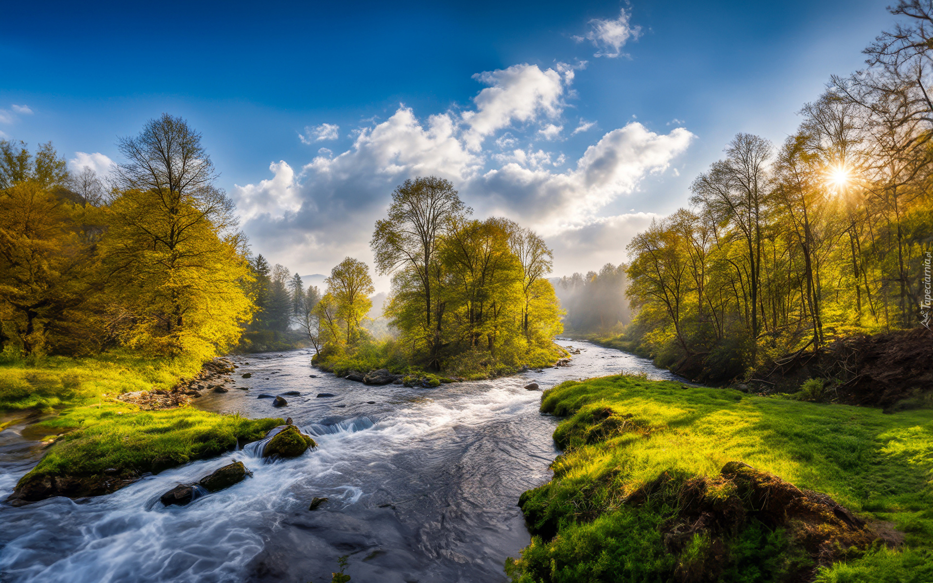 Edytor tapety: Promienie słońca w koronach drzew nad rzeką