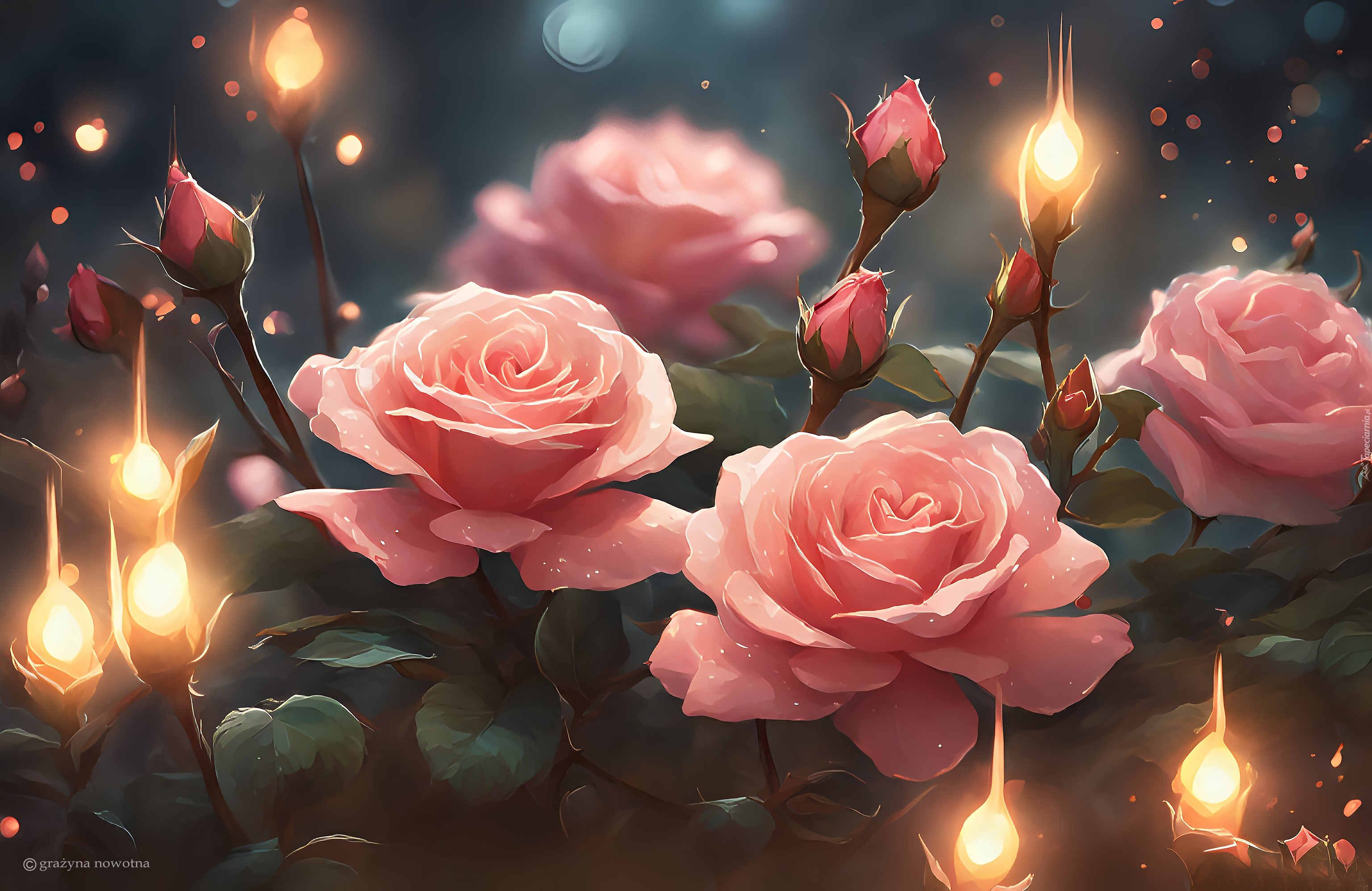 Edytor tapety: Różowe róże z pąkami w blasku światła
