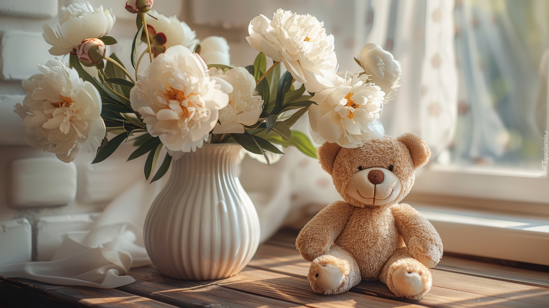 Edytor tapety: Jasnobrązowy miś obok białego wazonu z piwoniami