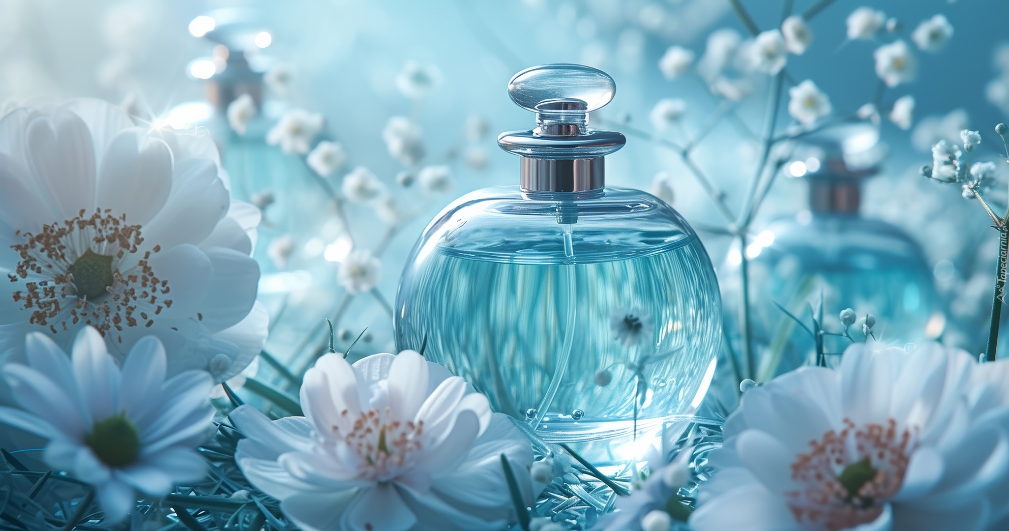 Edytor tapety: Grafika z niebieskim flakonem perfum wśród białych kwiatów