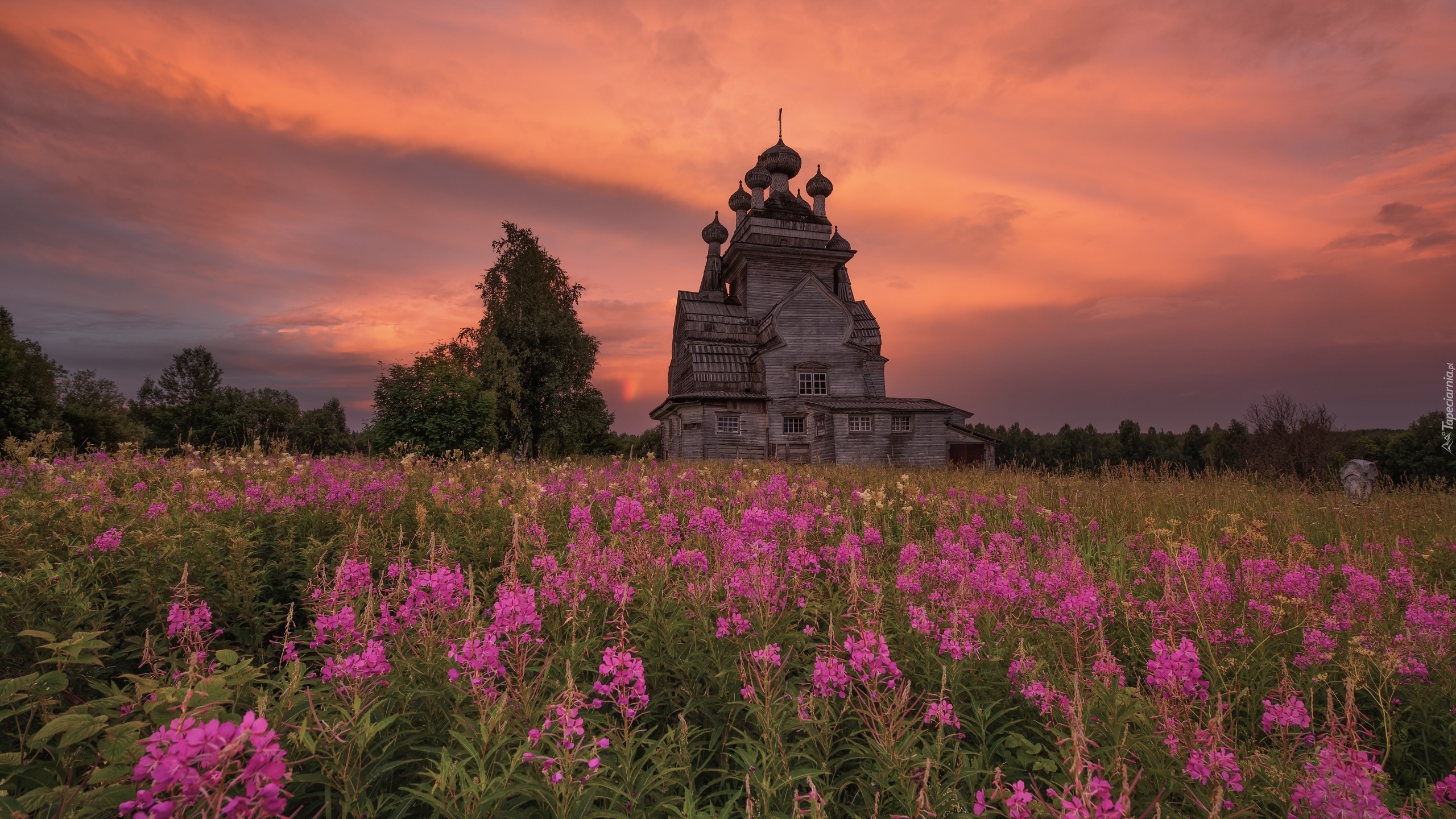 Edytor tapety: Cerkiew obok drzew na ukwieconej łące