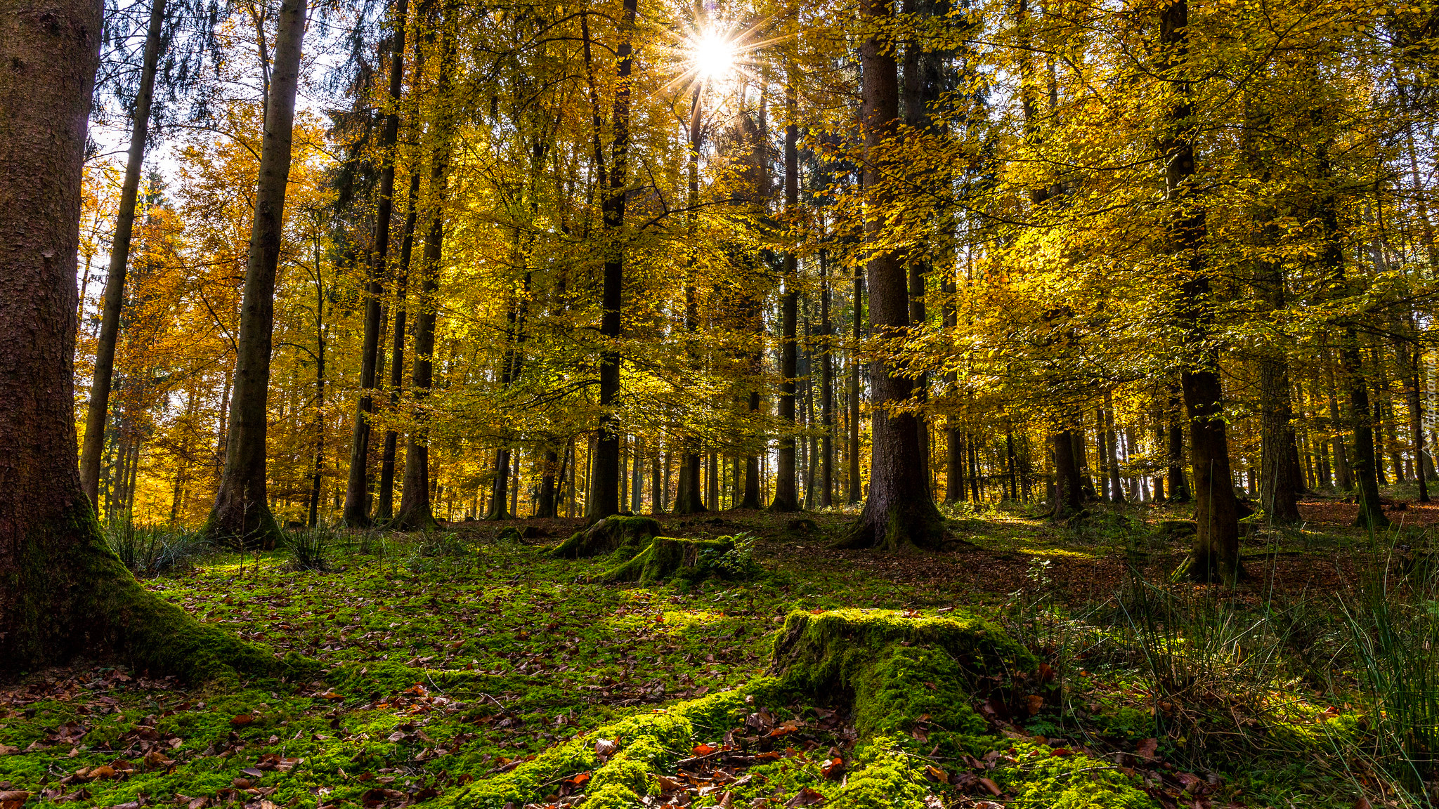Edytor tapety: Pniaki porośnięte mchem w rozświetlonym lesie