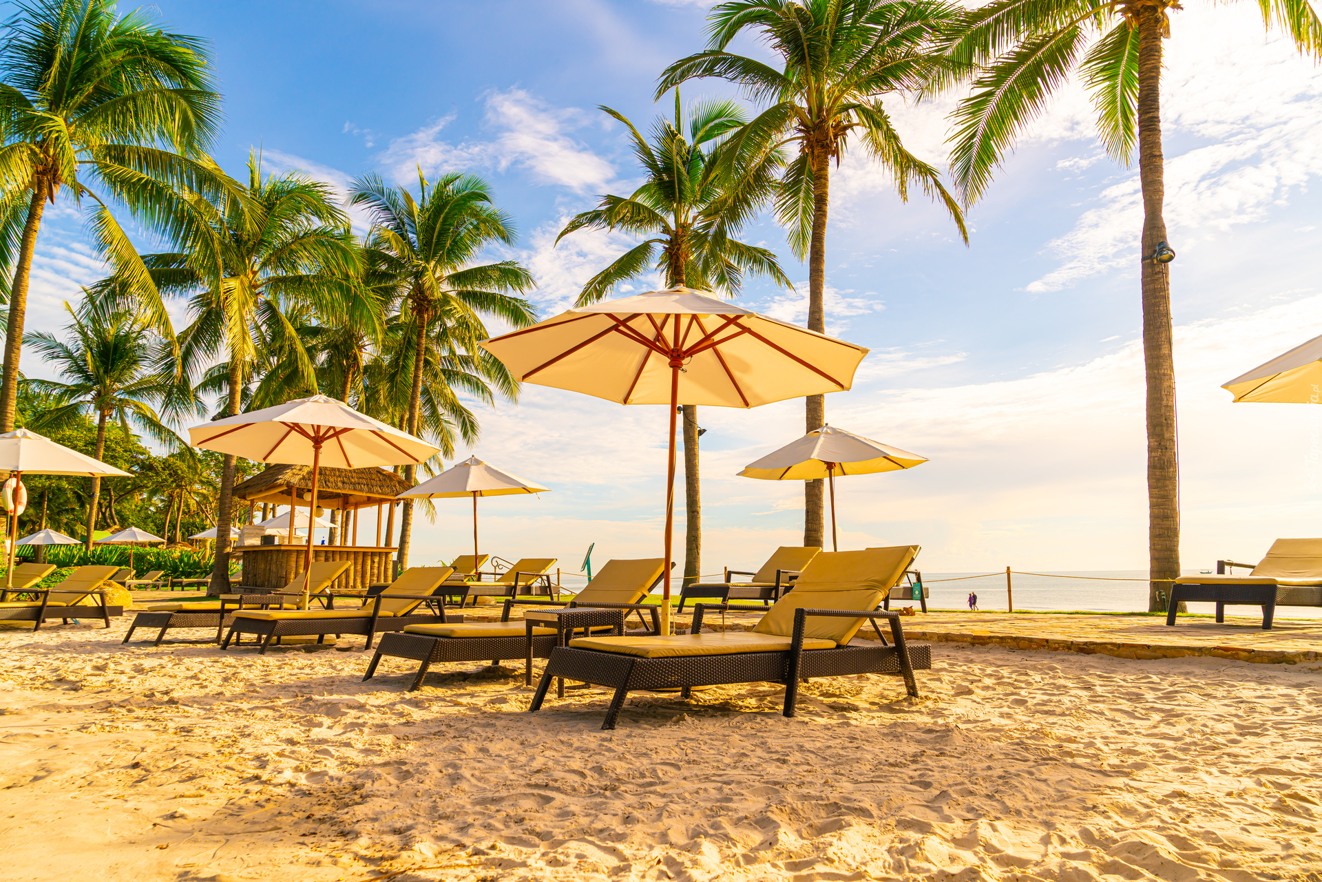 Edytor tapety: Leżaki i parasole na plaży pod palmami