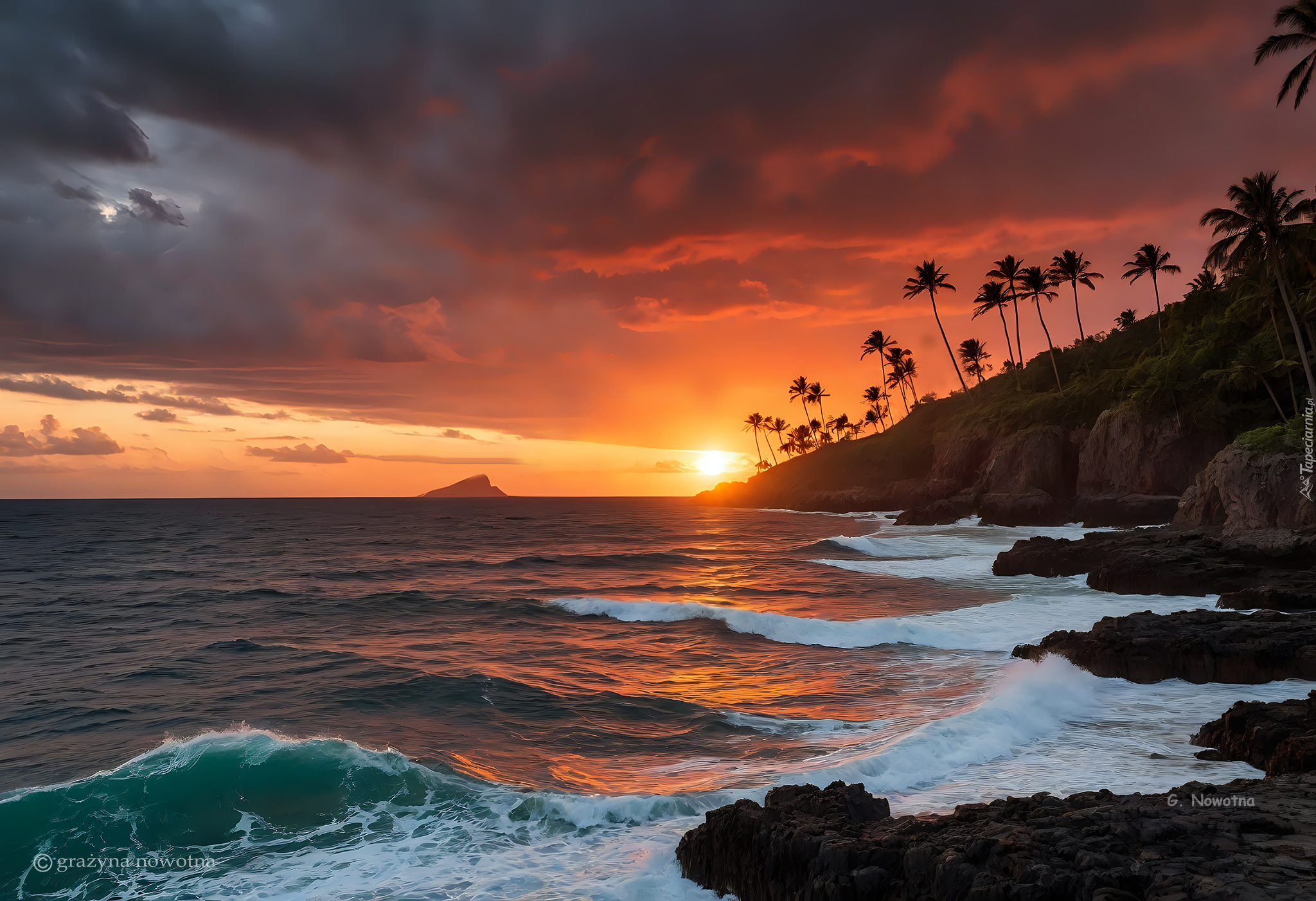Edytor tapety: Klif i morze w blasku zachodzącego słońca