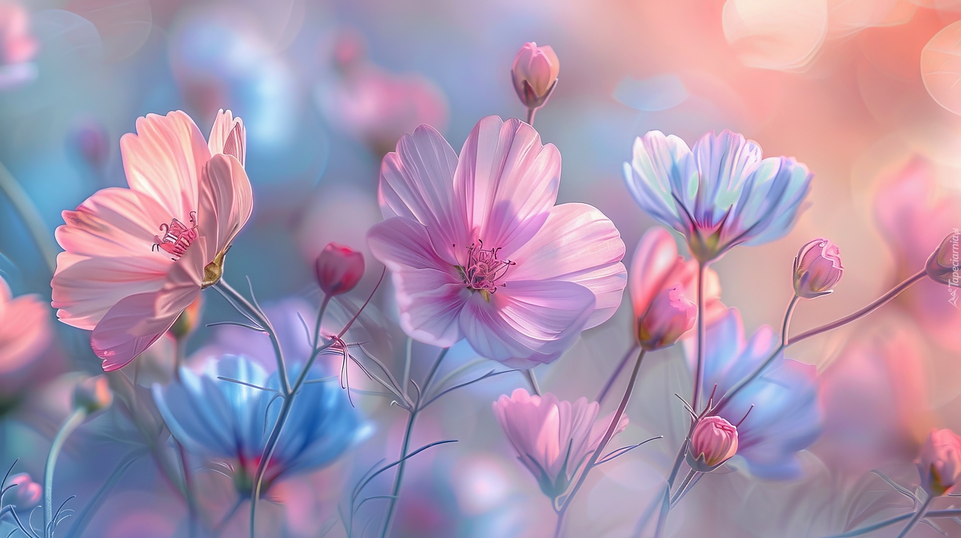Edytor tapety: Niebieska i różowa kosmea na kolorowym tle