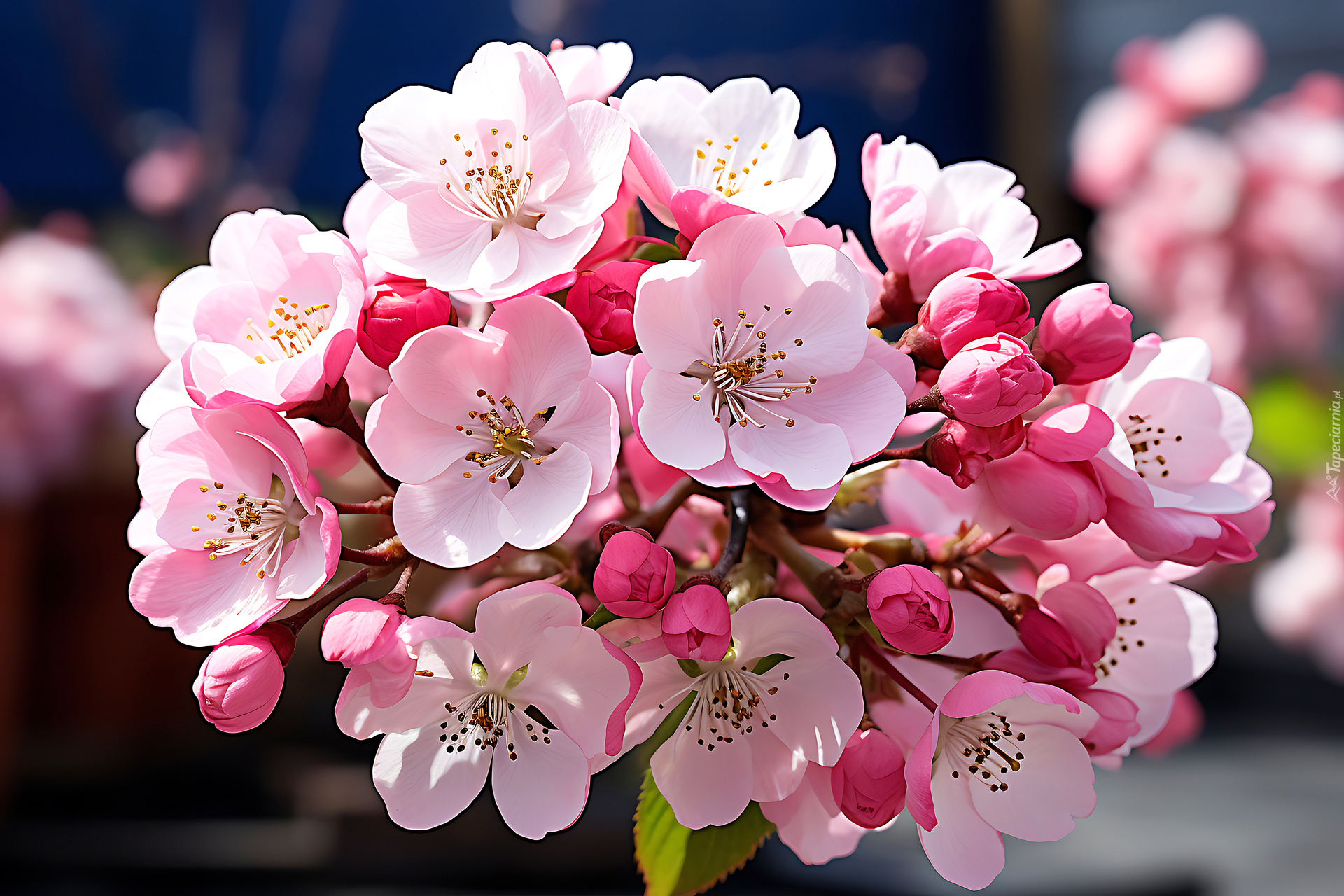 Edytor tapety: Różowe kwiaty i pąki na gałązce w zbliżeniu