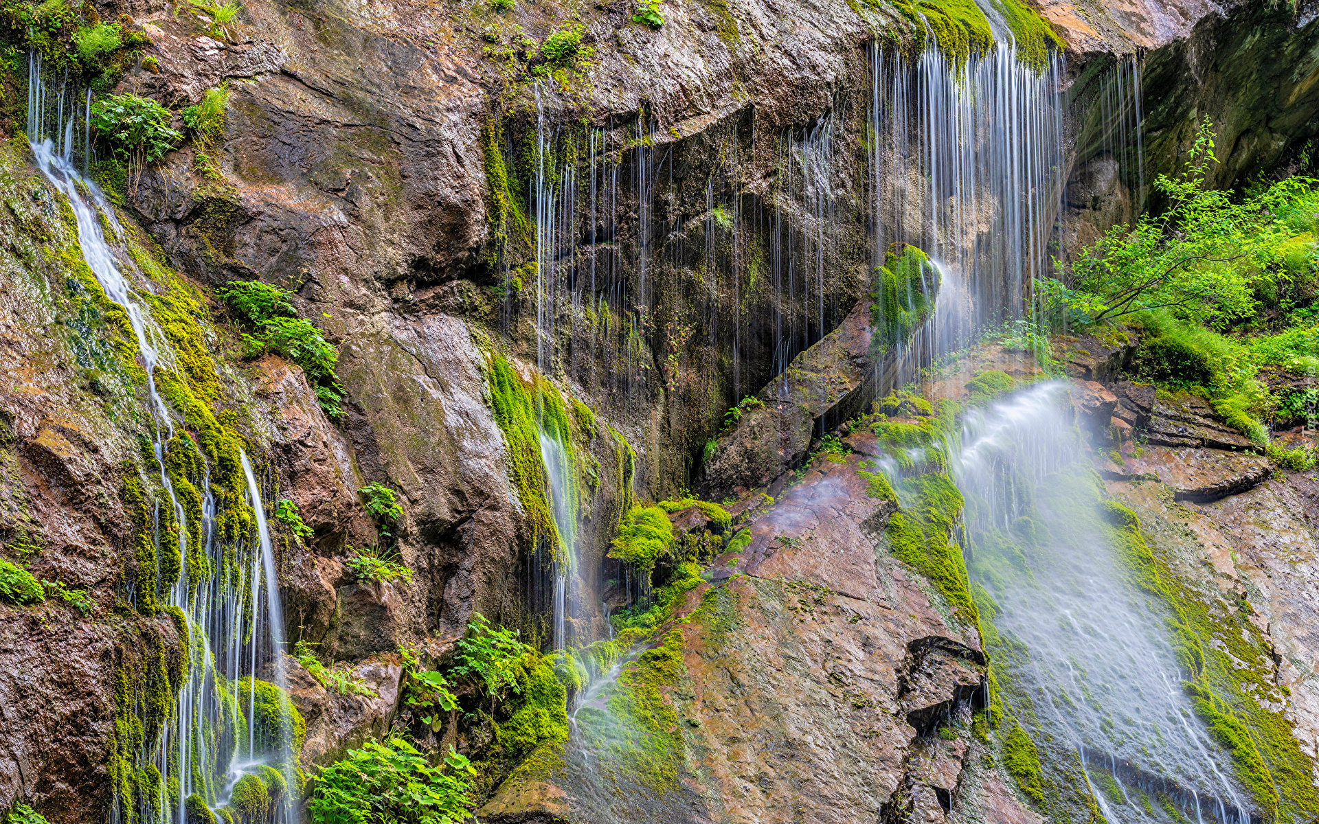 Edytor tapety: Wodospady na skałach pokrytych mchem