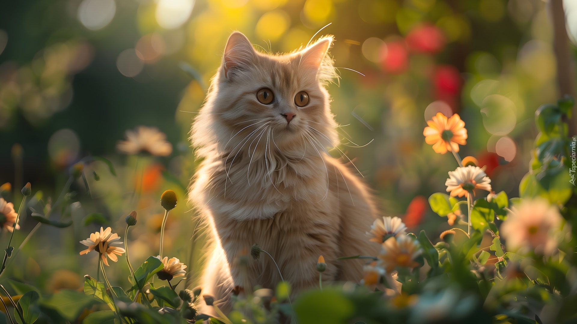 Edytor tapety: Rudy kot pośród kwiatów