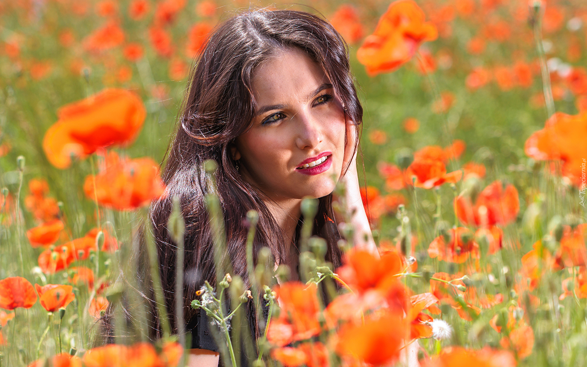 Edytor tapety: Kobieta na polu czerwonych maków