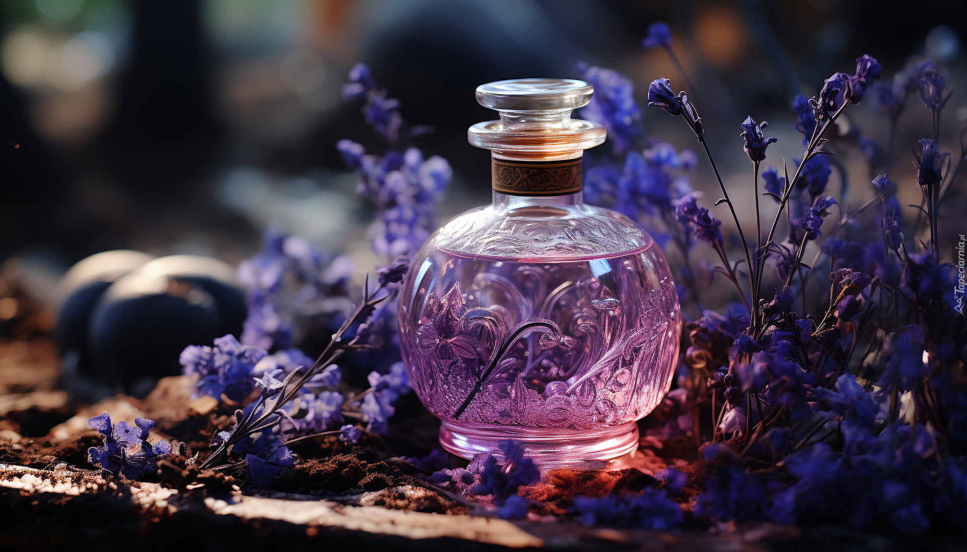Edytor tapety: Flakon perfum obok kwiatów lawendy