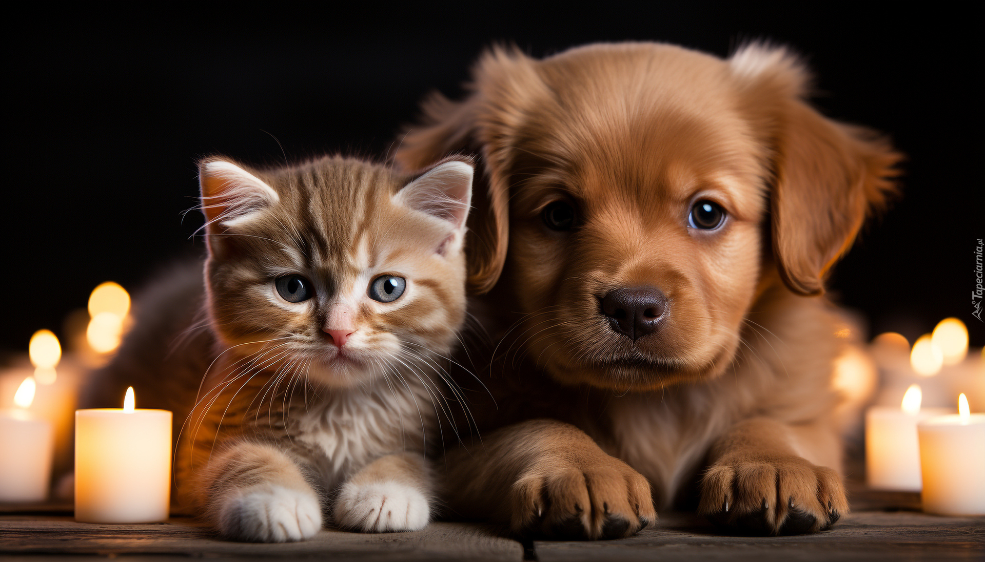 Edytor tapety: Mały rudawy kotek i szczeniak obok świec