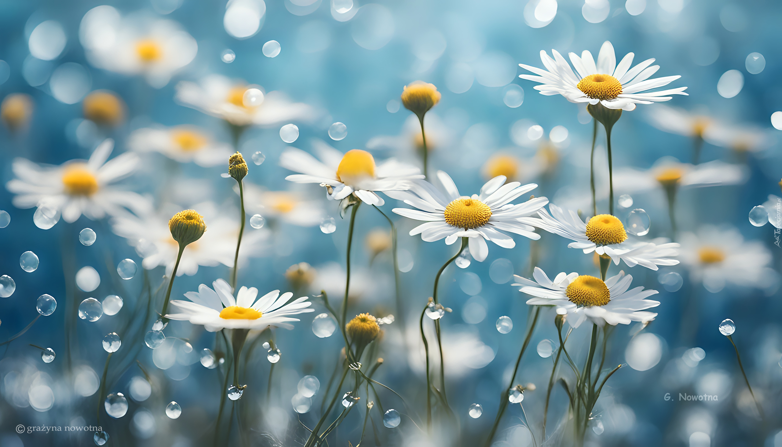 Edytor tapety: Białe margerytki i krople wody na niebieskim tle