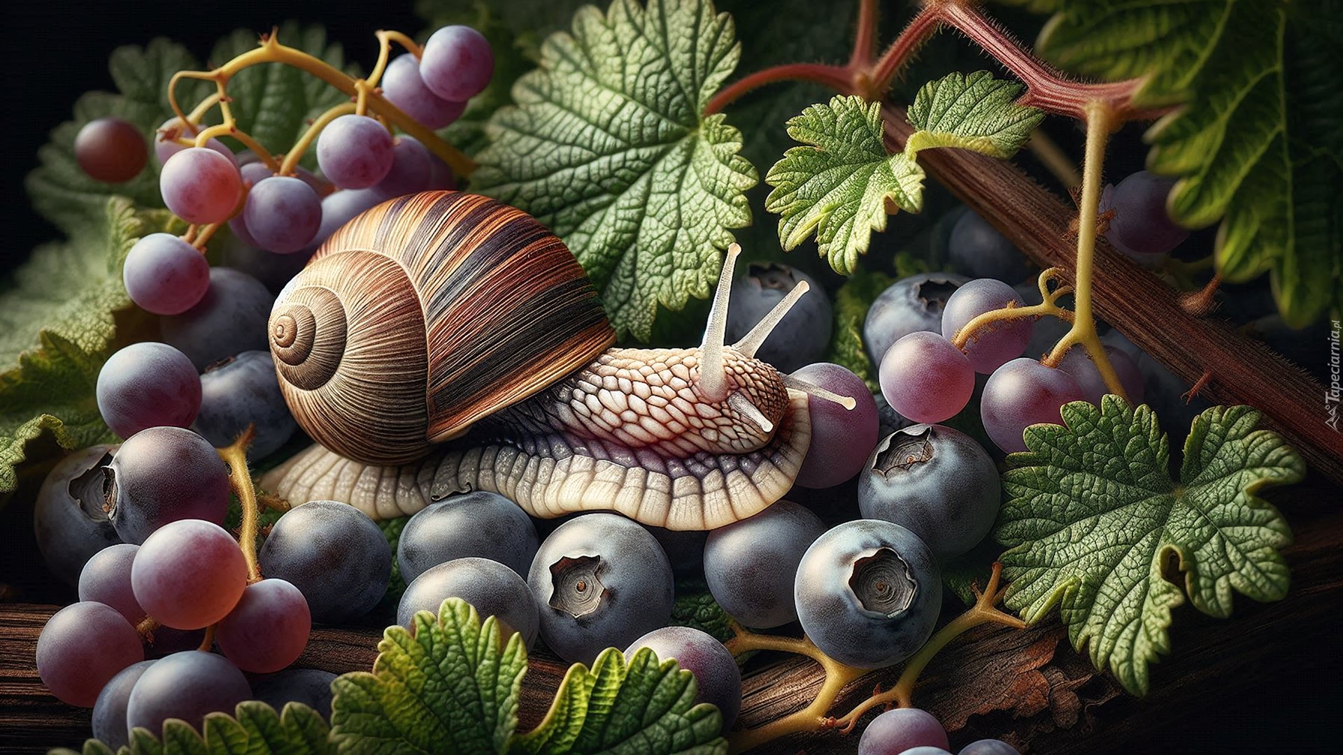 Edytor tapety: Ślimak na borówkach i winogronach
