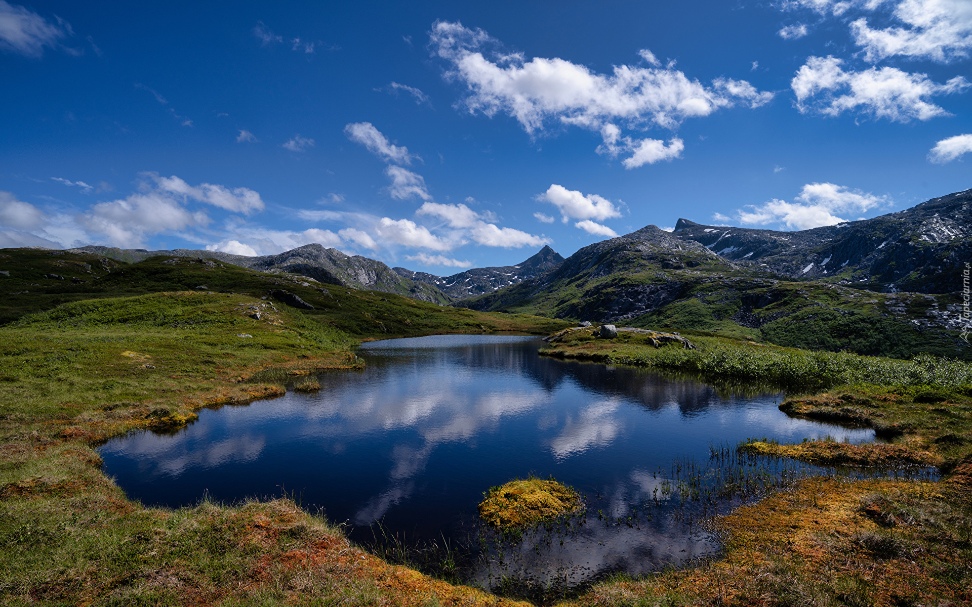 Edytor tapety: Białe obłoki nad górami i jeziorem