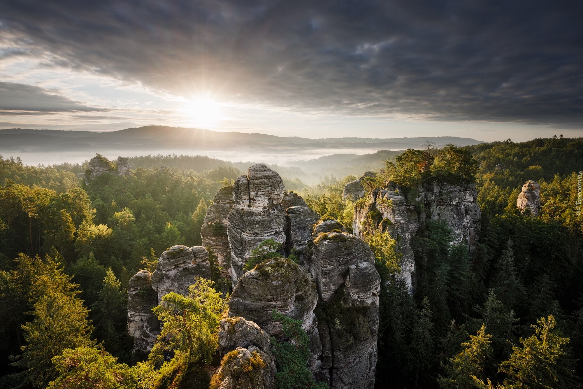 Edytor tapety: Ciemne chmury i rozświetlone skały w Czeskim Raju