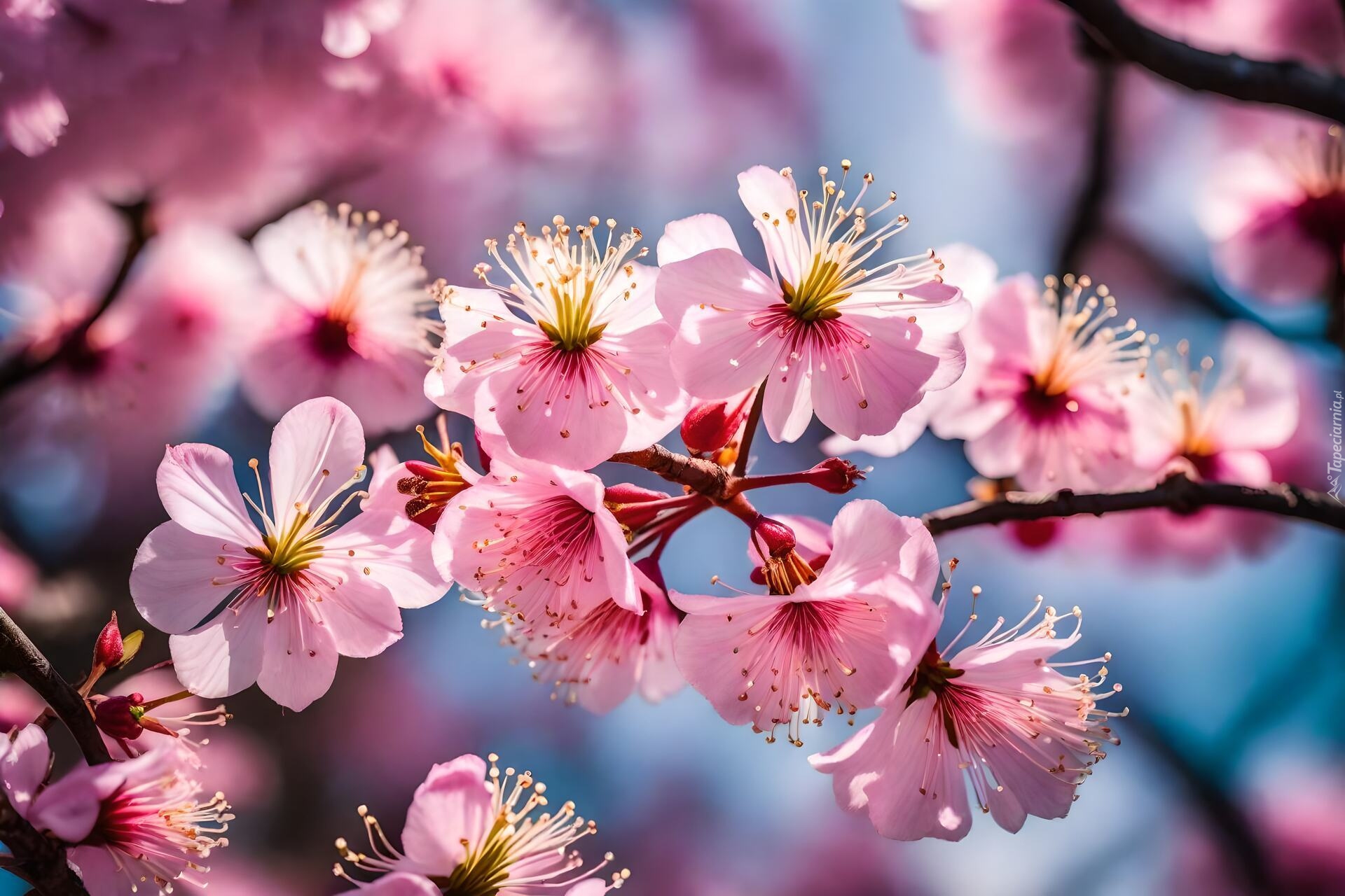Edytor tapety: Rozświetlone światłem różowe kwiaty drzewa owocowego