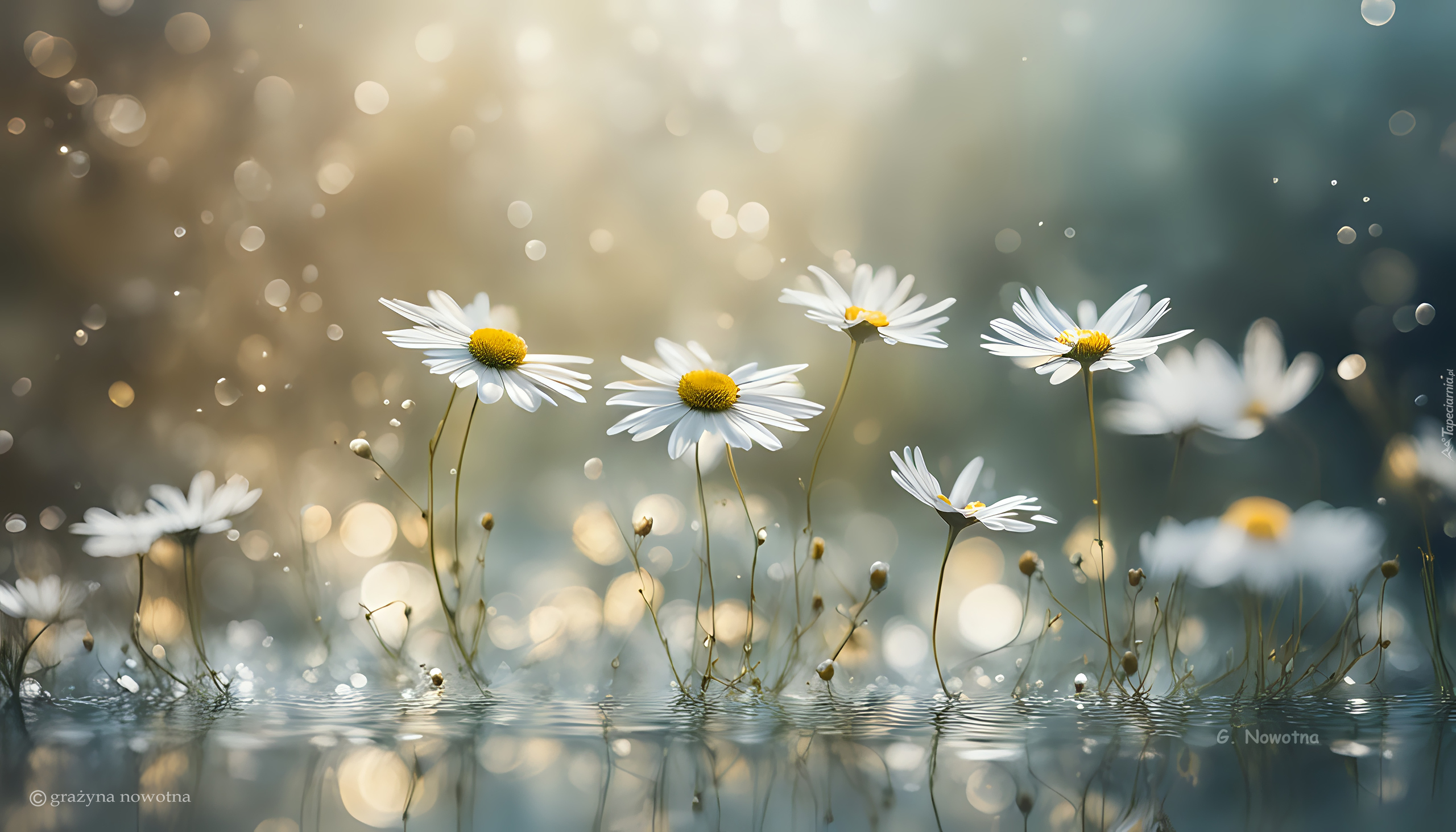 Edytor tapety: Rozświetlone światłem białe margerytki w wodzie