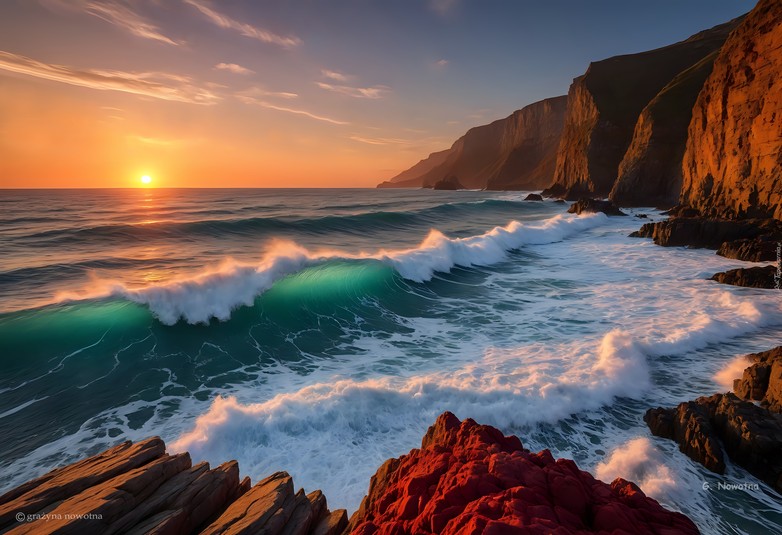 Edytor tapety: Rozświetlone zachodzącym słońcem klify i fale na morzu