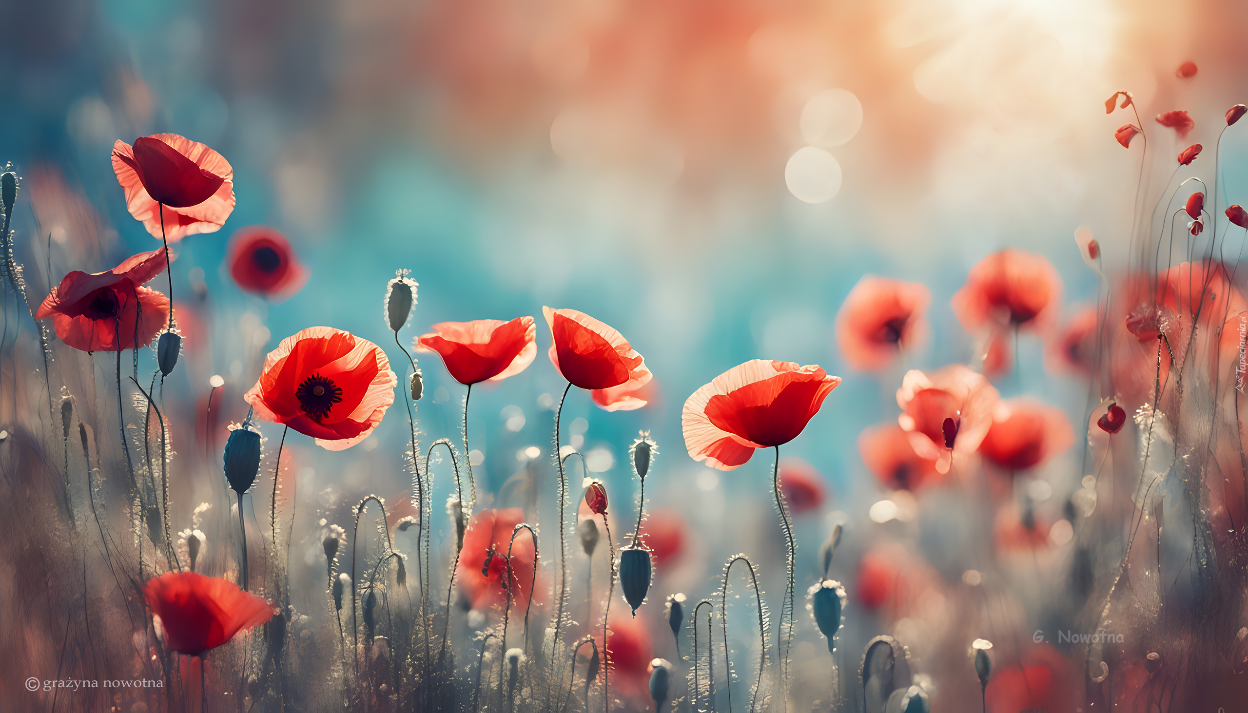Edytor tapety: Rozświetlone światłem czerwone maki na polu
