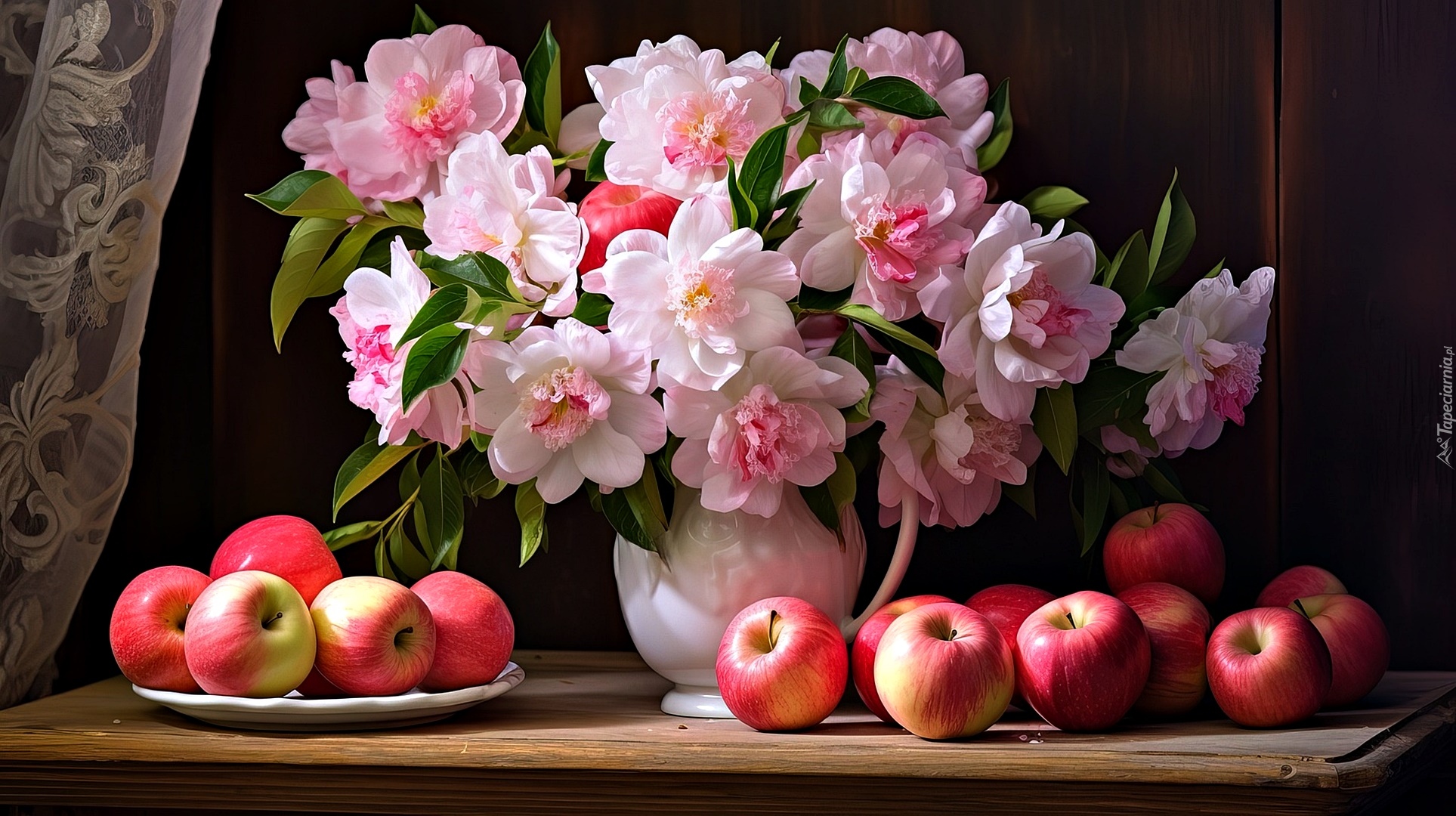 Edytor tapety: Jabłka obok dzbanka z rozwiniętymi kwiatami na stole