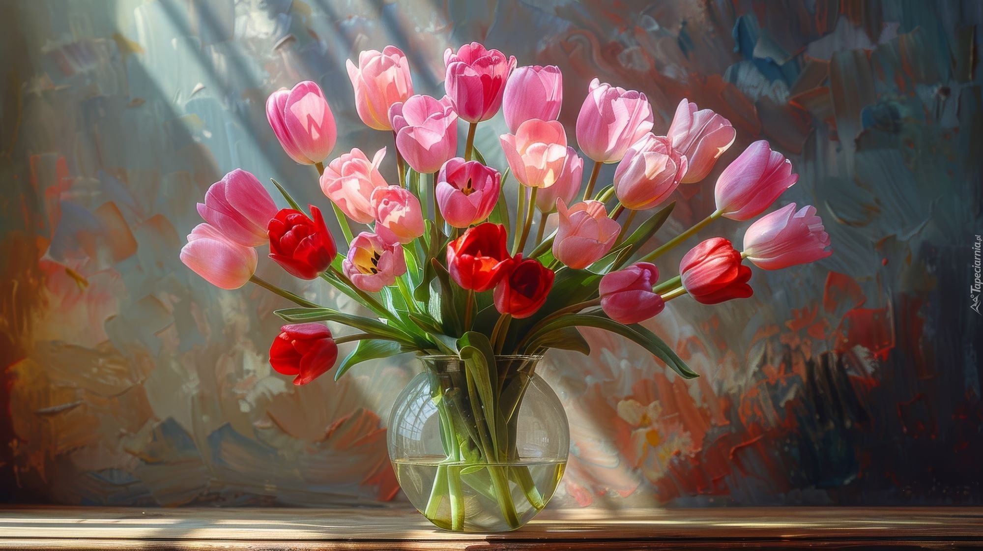 Edytor tapety: Różowe i czerwone tulipany w szklanym wazonie