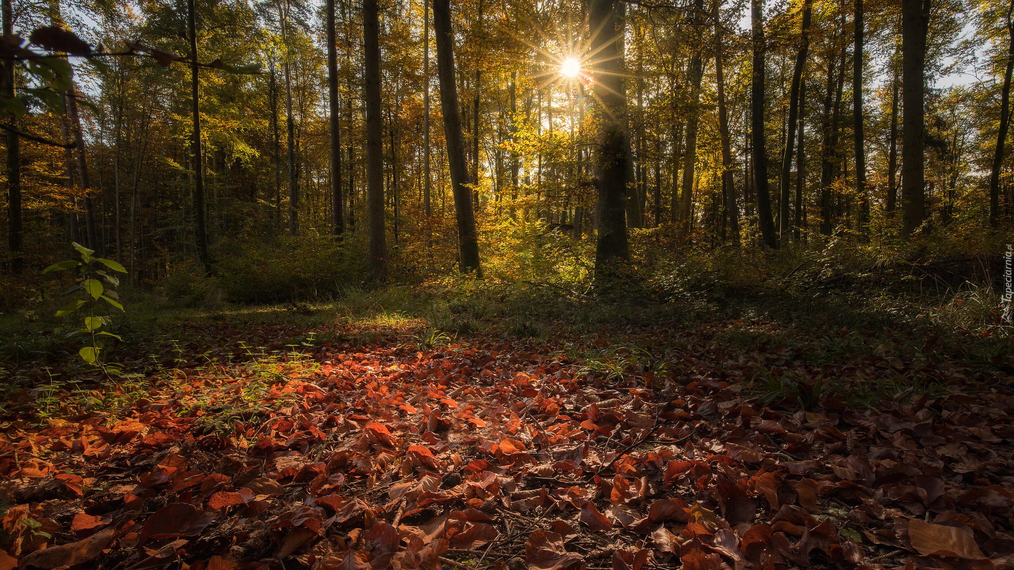 Edytor tapety: Rozświetlone promieniami słońca opadłe liście w lesie