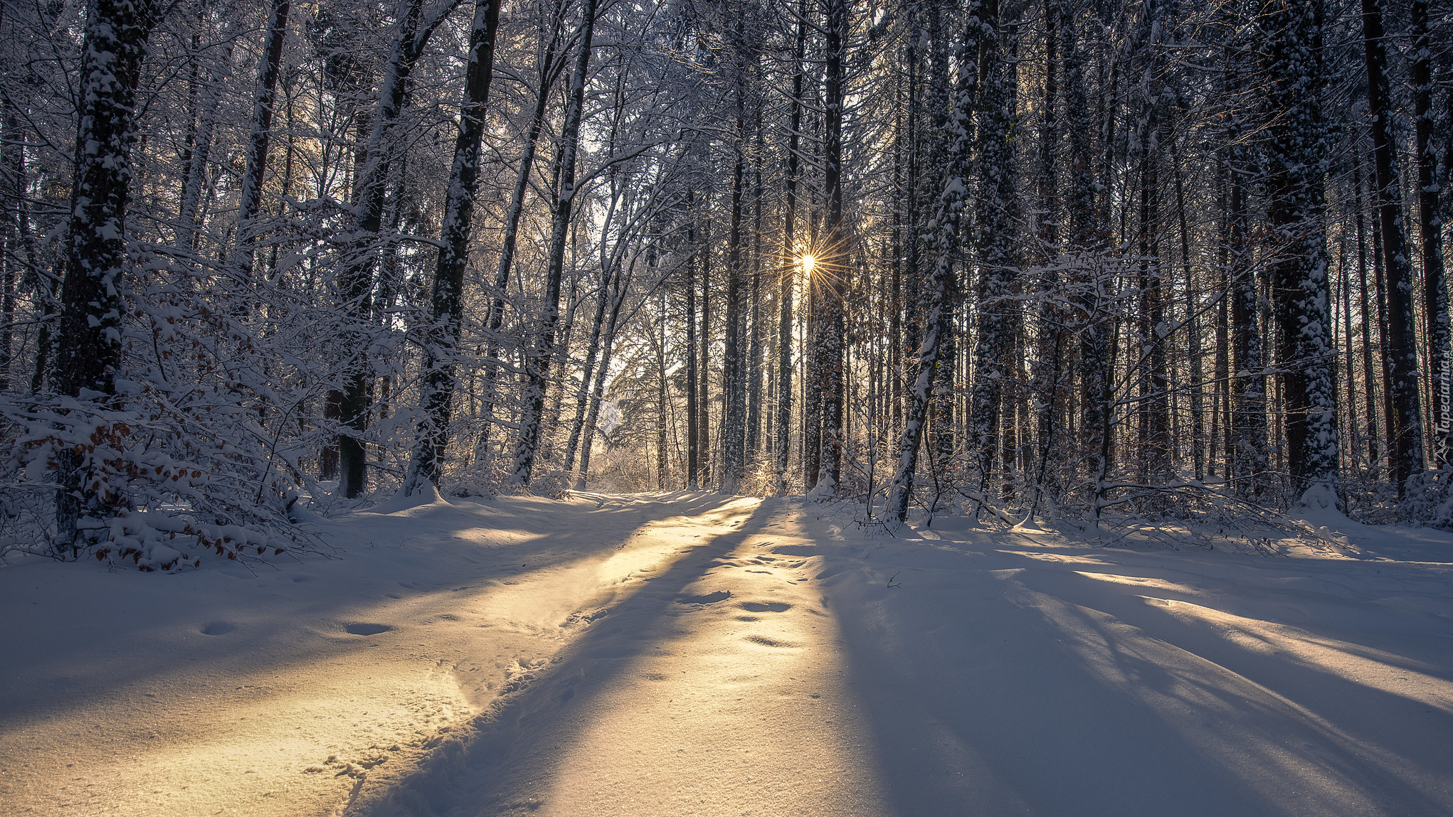 Edytor tapety: Słońce wśród drzew w zimowym lesie