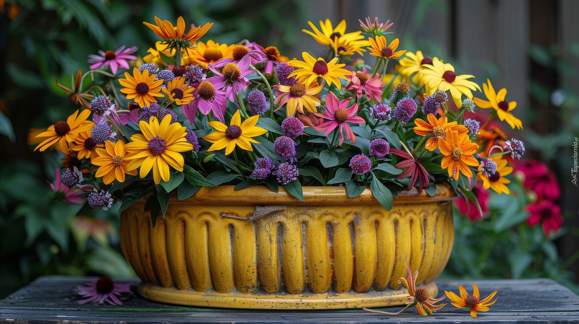 Edytor tapety: Rudbekia i inne kolorowe kwiaty w żółtej donicy